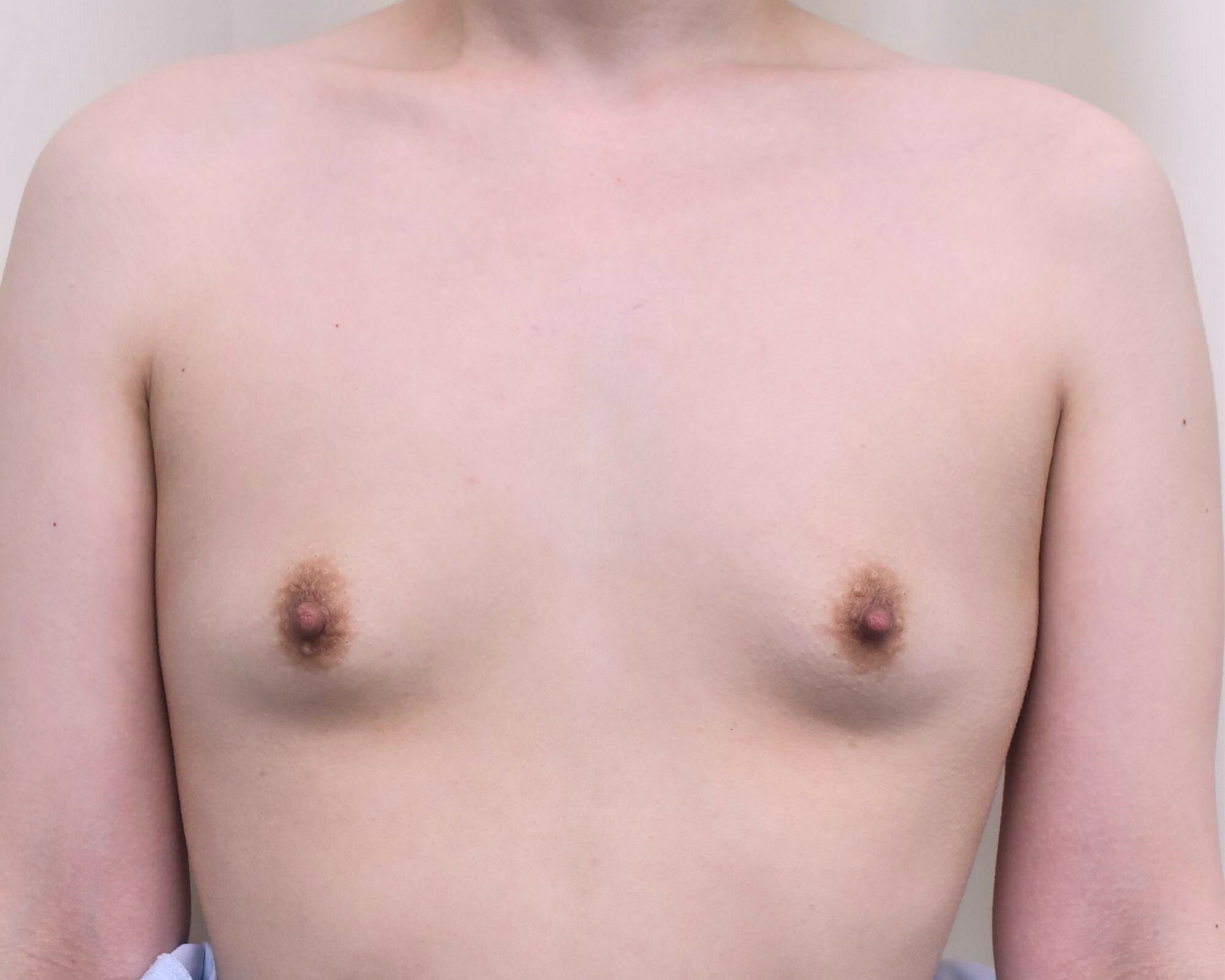 20代女性の人工乳腺による豊胸術になります。もともとがBカップくらいであったのを3カップ弱アップしたいとご希望でしたのでモティバのDEMI250ccを使用しました。バックサイズは患者様が現状からどの程度まで大きくしたいか、患者様の胸の骨格などを考慮し、選んでいます。100ccにつき1カップアップが目安であり、250ccであれば2.5カップアップが期待できるサイズになります。全身麻酔、脇からのアプローチで行いました。 術後写真は、手術後1か月ですが希望に近いサイズとなり、患者様にも喜んでいただきました