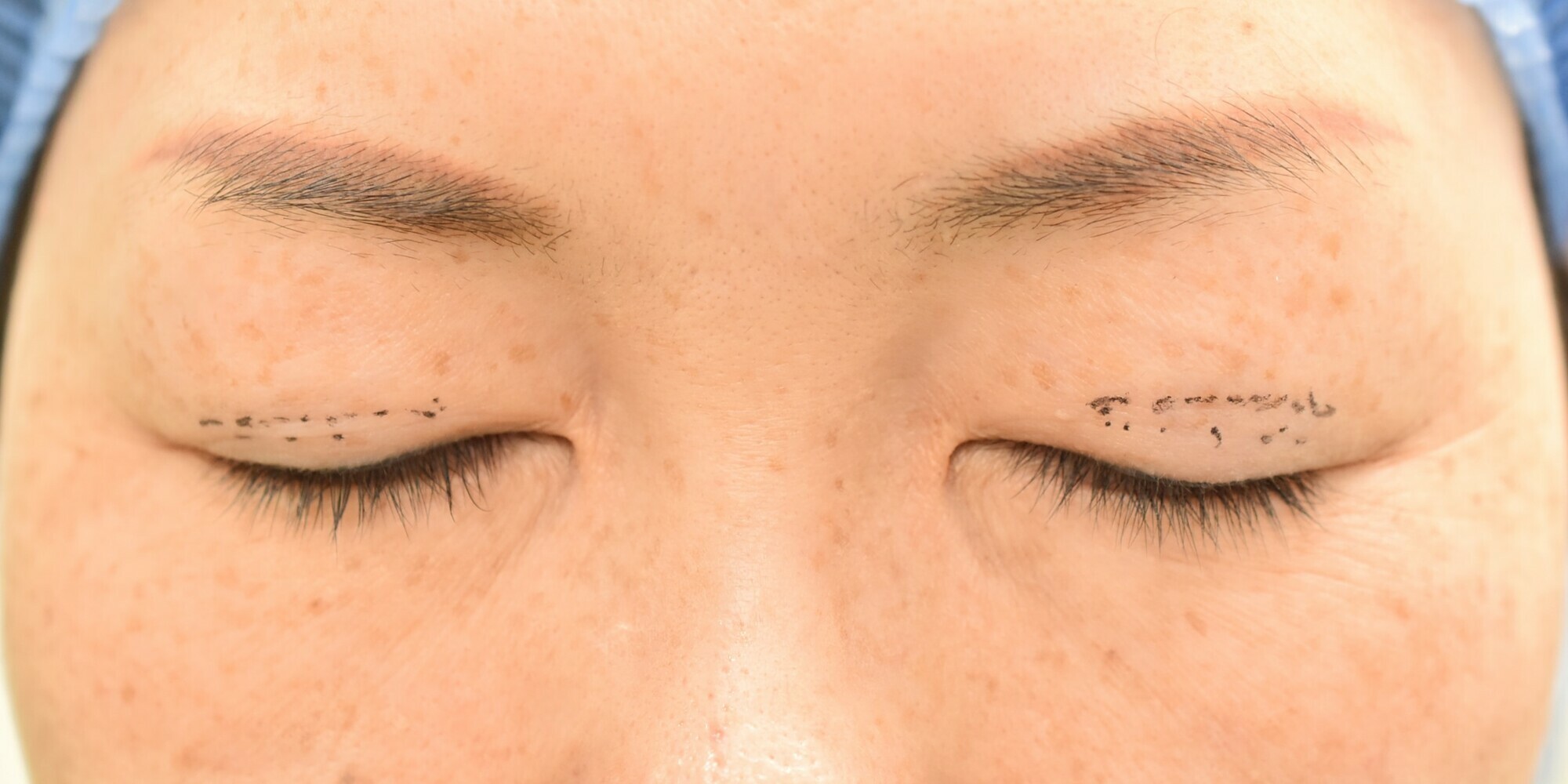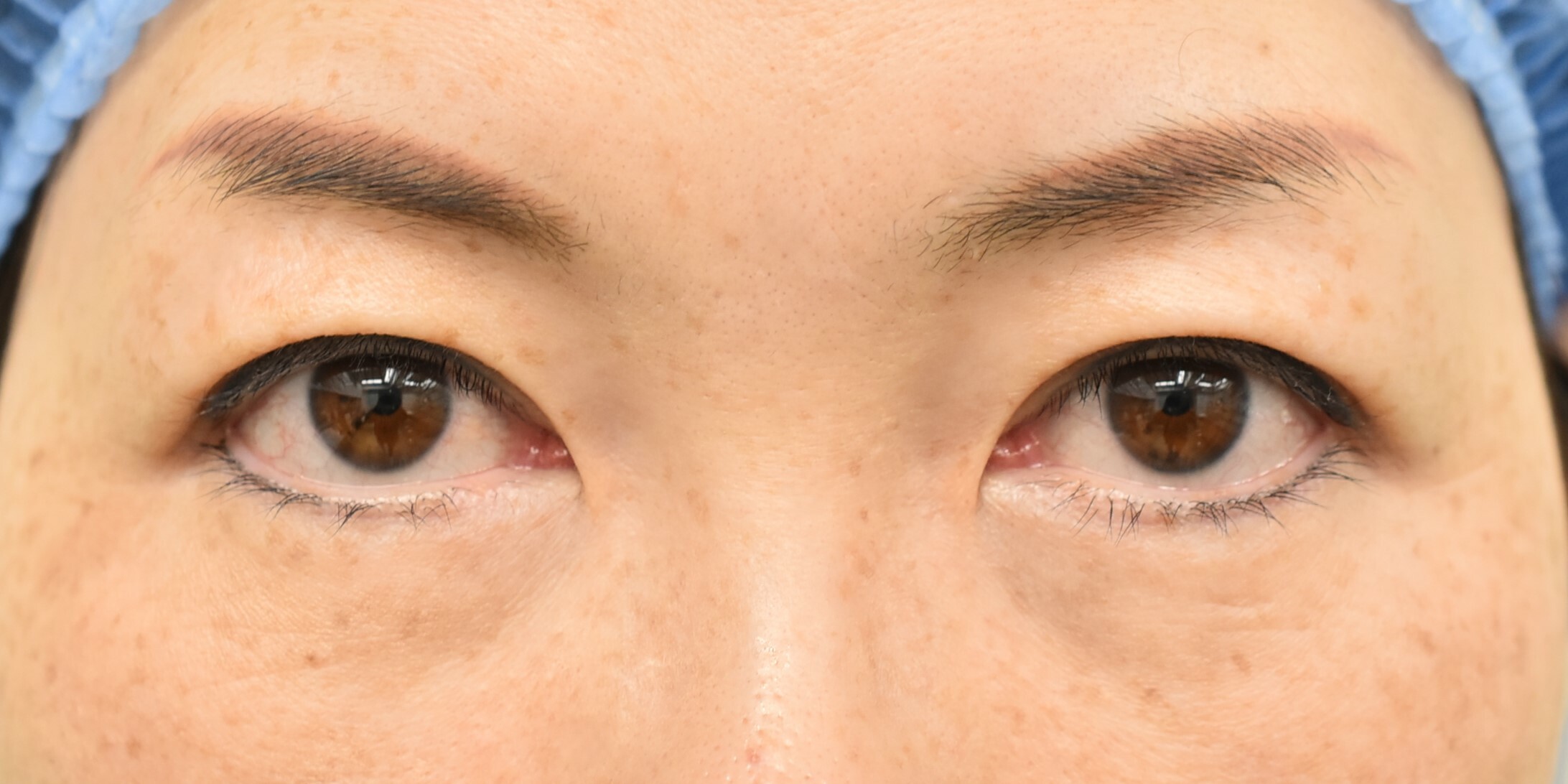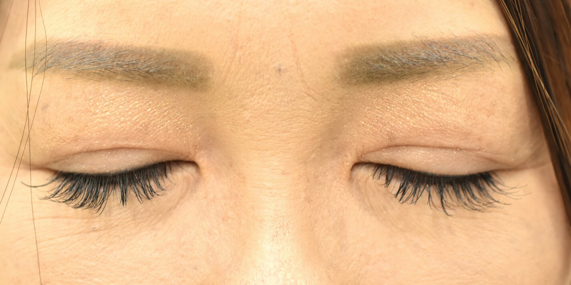 40代 女性 部分切開法+脱脂の症例になります。埋没法を以前に行われていましたが、癖が緩んできたため、取れにくい二重にするために前記手術を行いました。 皮下脂肪を切除することで、皮膚と瞼板の癒着広範囲に起こすことで、埋没法よりも取れにくい二重の作成が可能です。また脱脂をすることで、腫れぼったさの改善だけでなく、目尻側のラインが出やすくなる効果もあります。