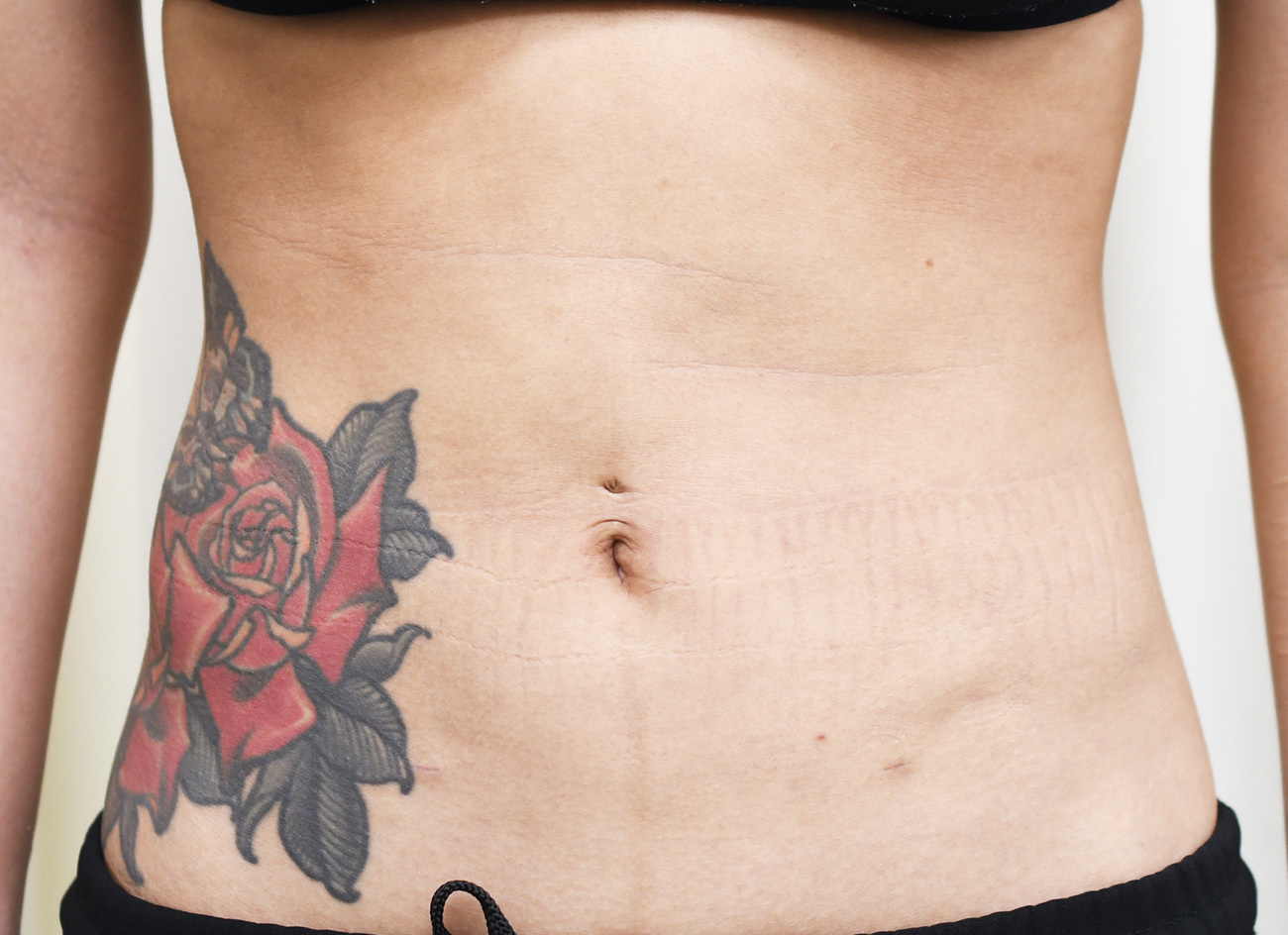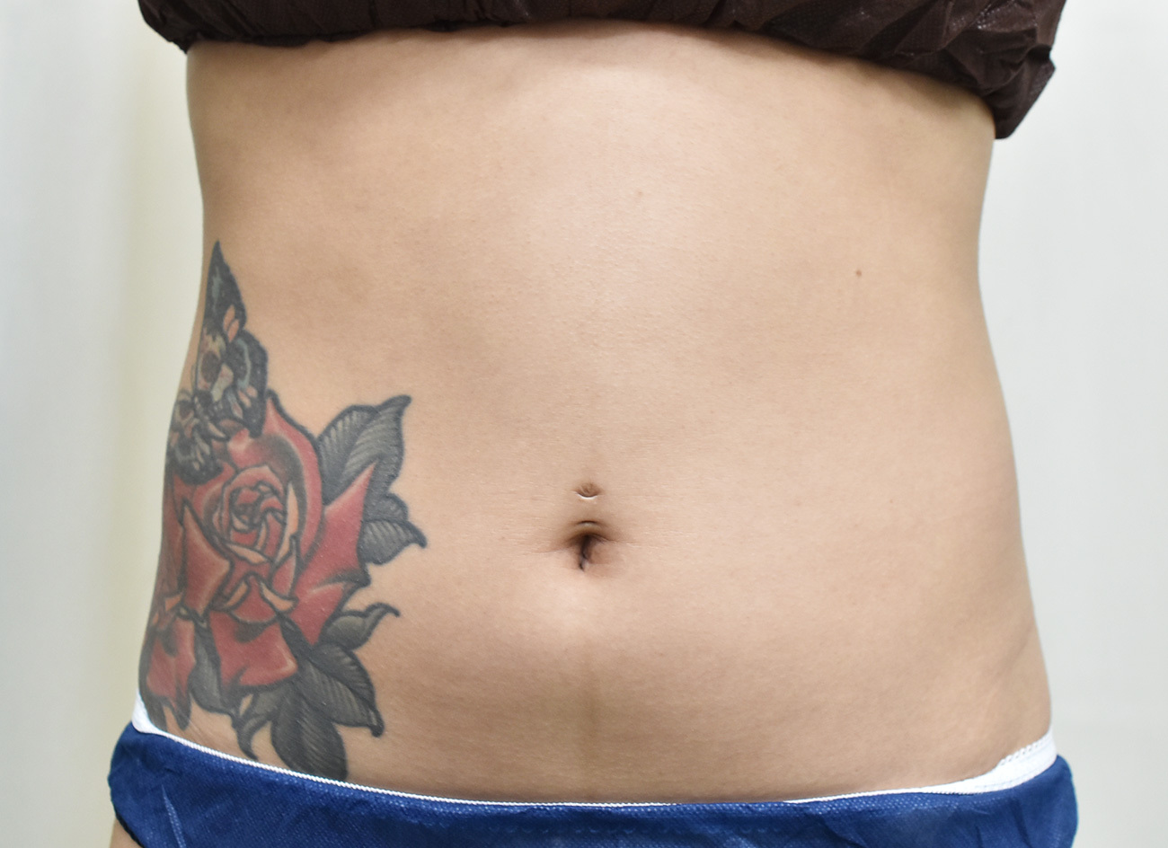 30代女性の腹部全体の脂肪吸引になります。腹部全体の脂肪吸引を行いました。 麻酔は硬膜外麻酔もしくは、全身麻酔を基本として局所麻酔を併用して行います。脂肪吸引量は約500ccでしたが、3か月後の写真では、しっかり細くなっています。