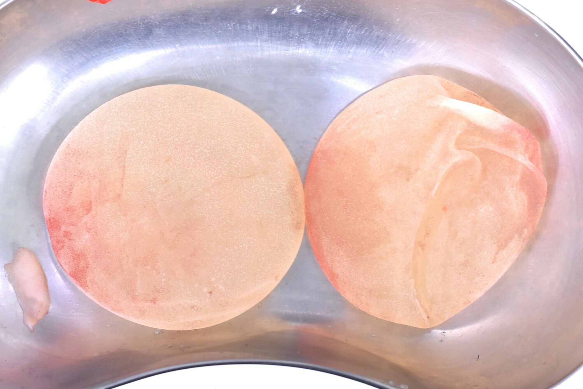 出血も被膜拘縮の原因であり、バッグ表面には固まった血液と被膜が付着し、バッグも変形していました。