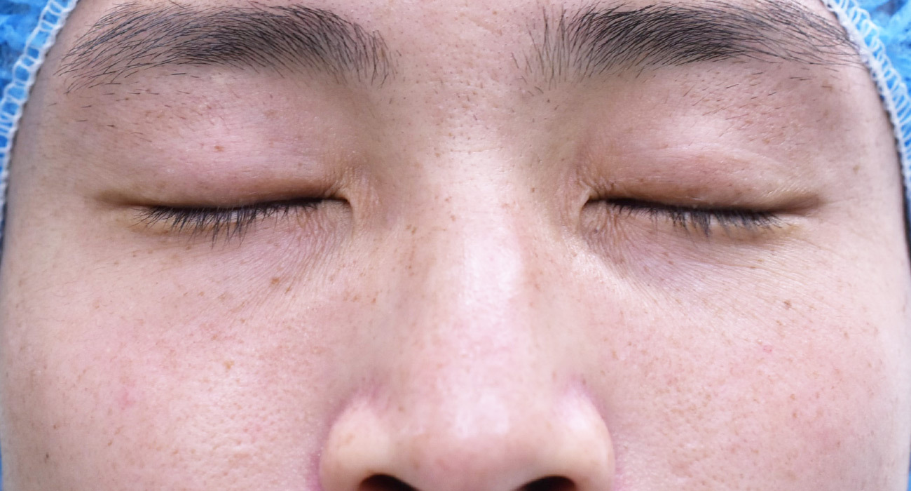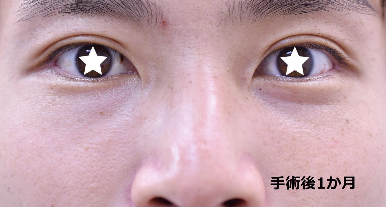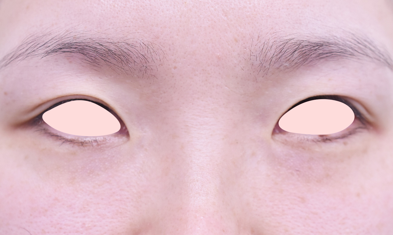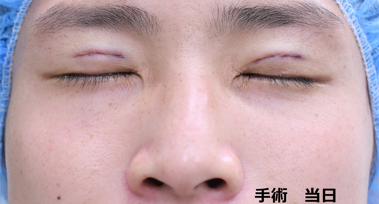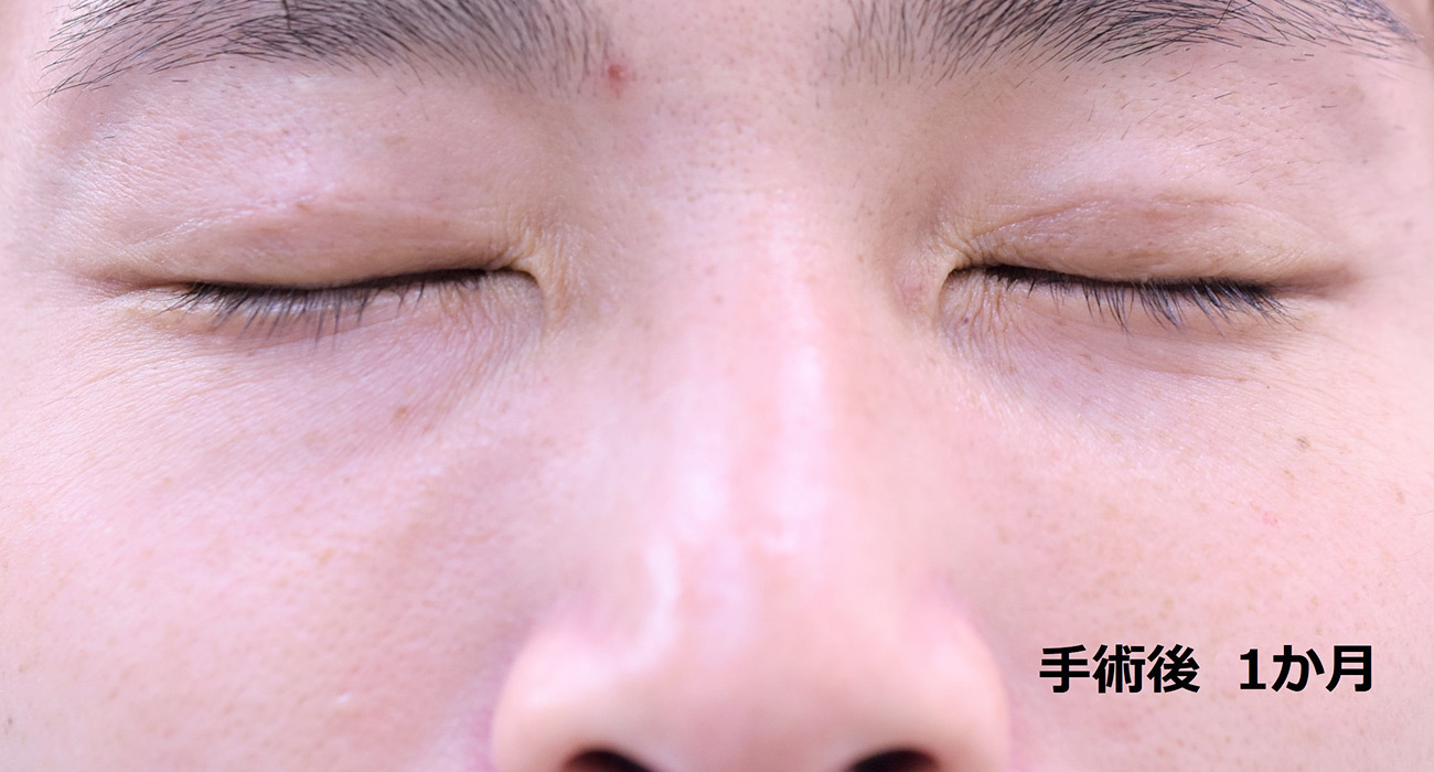30代男性の埋没法症例です 目が小さく見える一重を、大きくするために自然な幅で埋没法を行いました。8mm幅平行型でデザインしています。 直後は腫れがありますが、1か月後には自然な二重幅まで落ち着いていました。