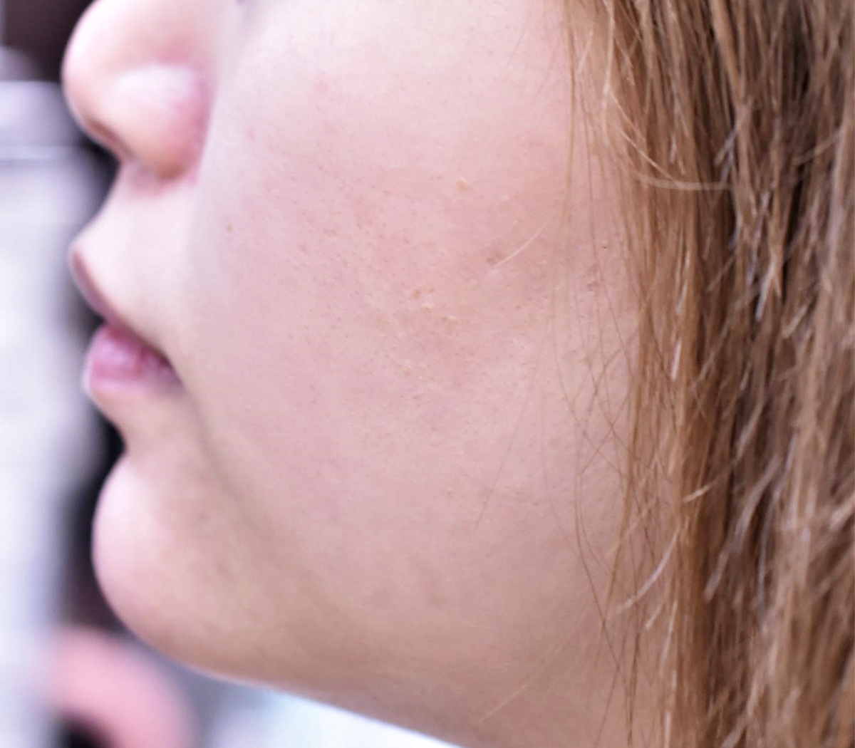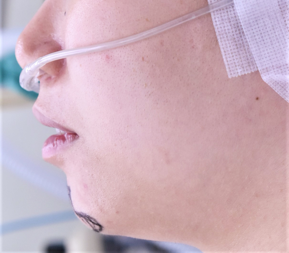 顎の先端を尖らせたい、顔を細く見せてたいとのご希望で顎のプロテーゼを行いました。横顔の写真で見てもわかるとおり、Eラインに大幅にオトガイ先端が足りていません。そこで当院で一番大きめの厚さ9.9mmの一番厚みのあるタイプを使用しました。