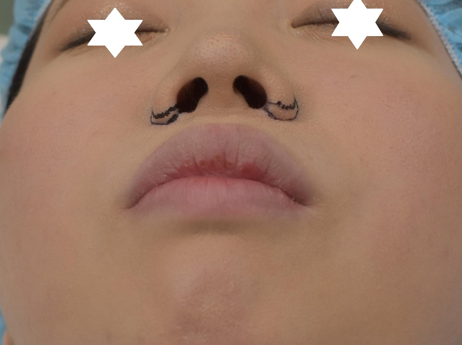 小鼻を目立たなく、小さくしたい。鼻の穴を見えにくくしたいとの希望で鼻翼縮小外側切除を行うことになりました。手術開始時のデザインは、最大幅3mmでマーキングを行い、途中で追加切除を行うか決める予定でしたが、だんご鼻であることを顧慮し追加はしないことにしました。