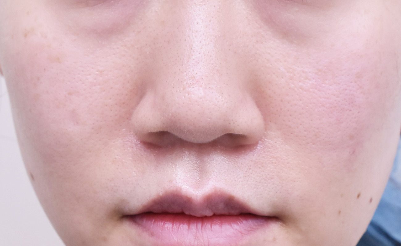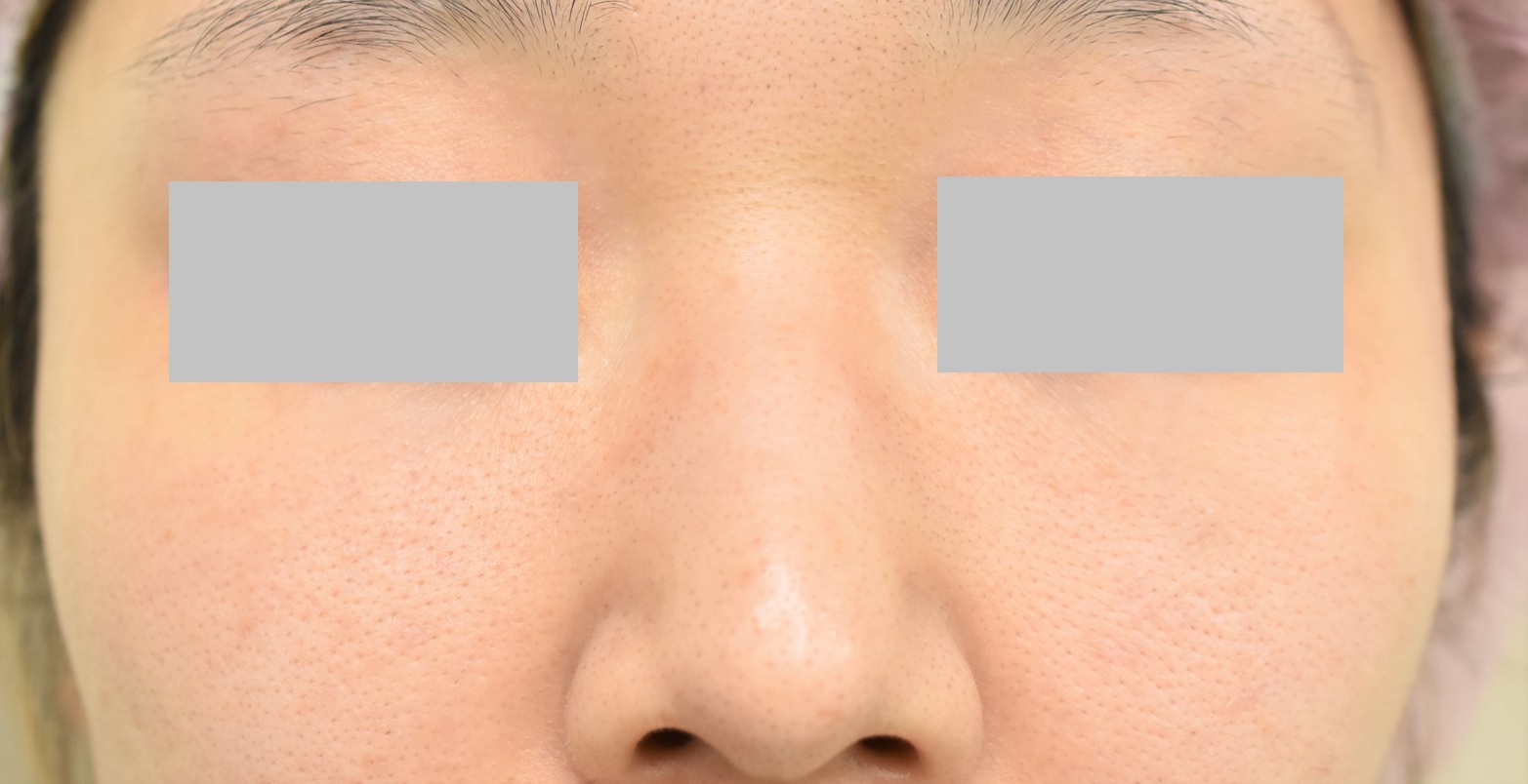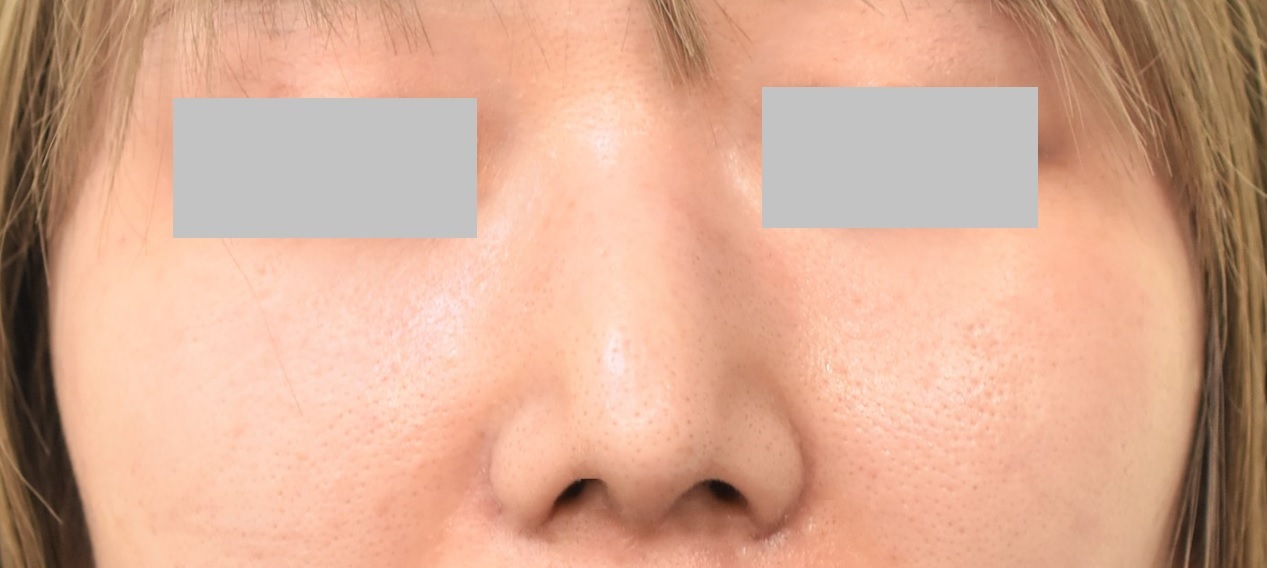 術前は鼻尖よりも下方に来ていた鼻翼の付け根が頭側に移動しているのがわかります。今回の手術では最初に4mm幅で切除後、ミラーチェックで患者様自身に確認いただき、更に2mm幅で追加切除しています。
