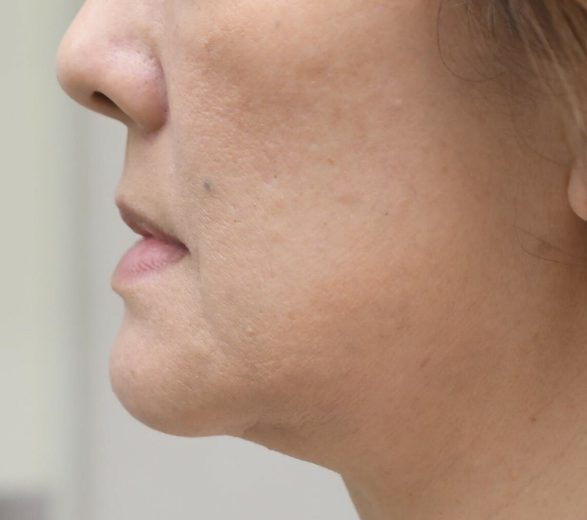 50代女性の顎の骨切り症例になります。若い頃からの理想であった、小顔やとがった顎にするために下顎骨骨切りを行いました。全身麻酔で行い、左右ともに最大8o幅にて切除を行っています。おとがい先端のたるみ、腫れの改善が遅かったため数回ステロイド注射を行い、6ヶ月後の時点で気にならない程度まで形状の改善が行えました。