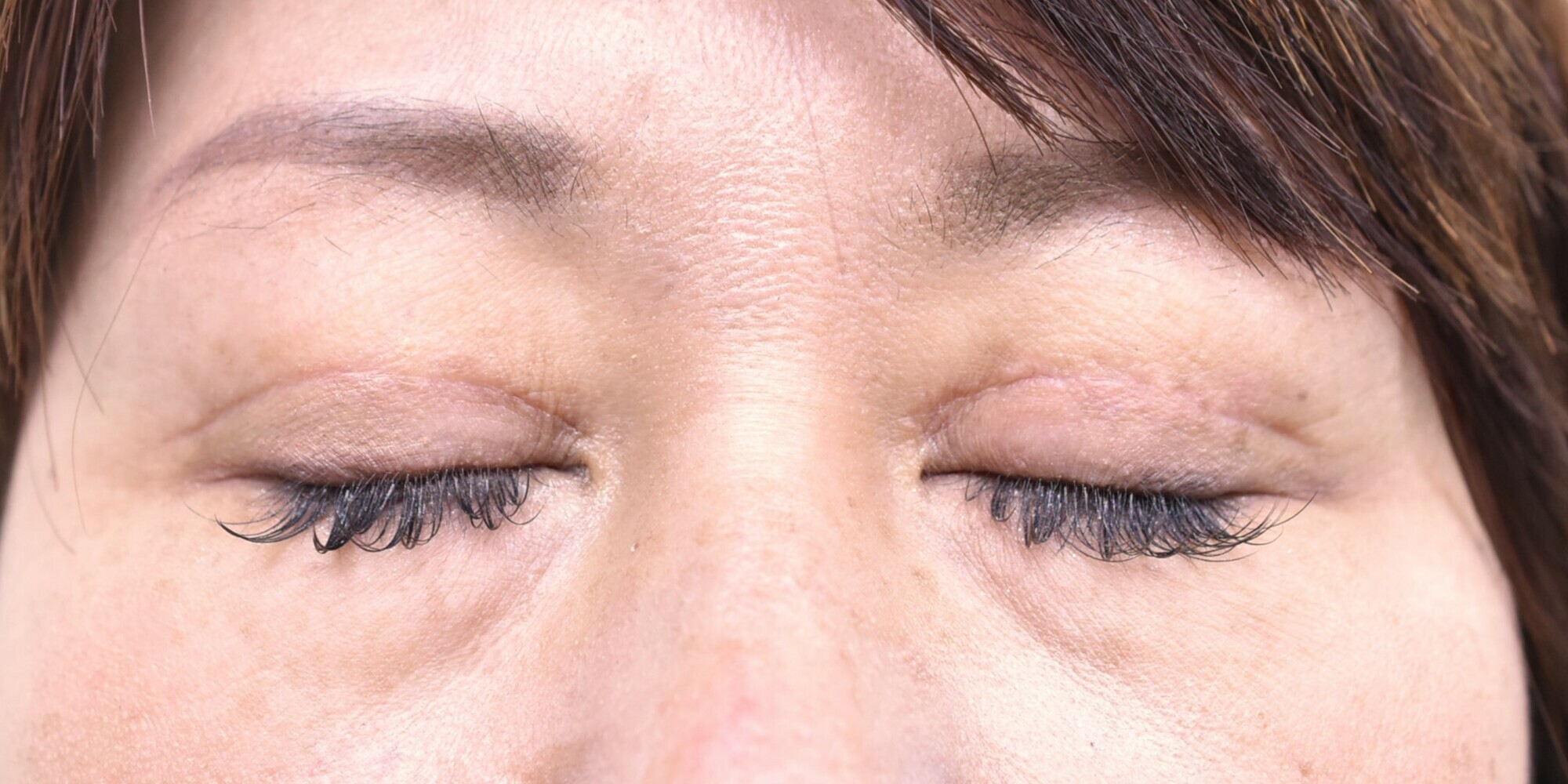 40代女性全切開法+挙筋短縮症例になります。加齢とともに目が開きにくくなってきた為、全切開法で二重を作成するとともに、たるみも切除しました。二重幅は8.5mm幅とし、たるみを最大6mm幅で切除しています。まつ毛の生え際に皮膚が覆いかぶさる、逆さまつ毛も確認できた為、まつ毛側のたるみも1mm幅で切除しています。脂肪取りと眼瞼下垂も併せて行いフルコースの手術となりました。術後写真は3ヶ月後になります。眉毛を挙上する癖が消え、目の開きも良くなり、ぱっちりとした二重ができました。