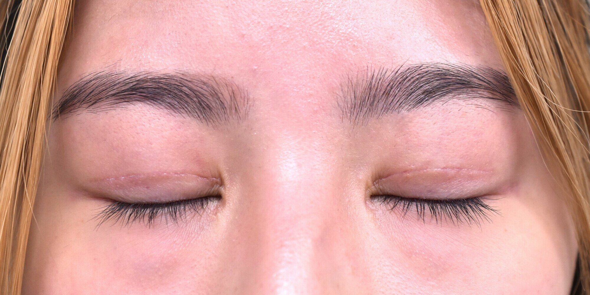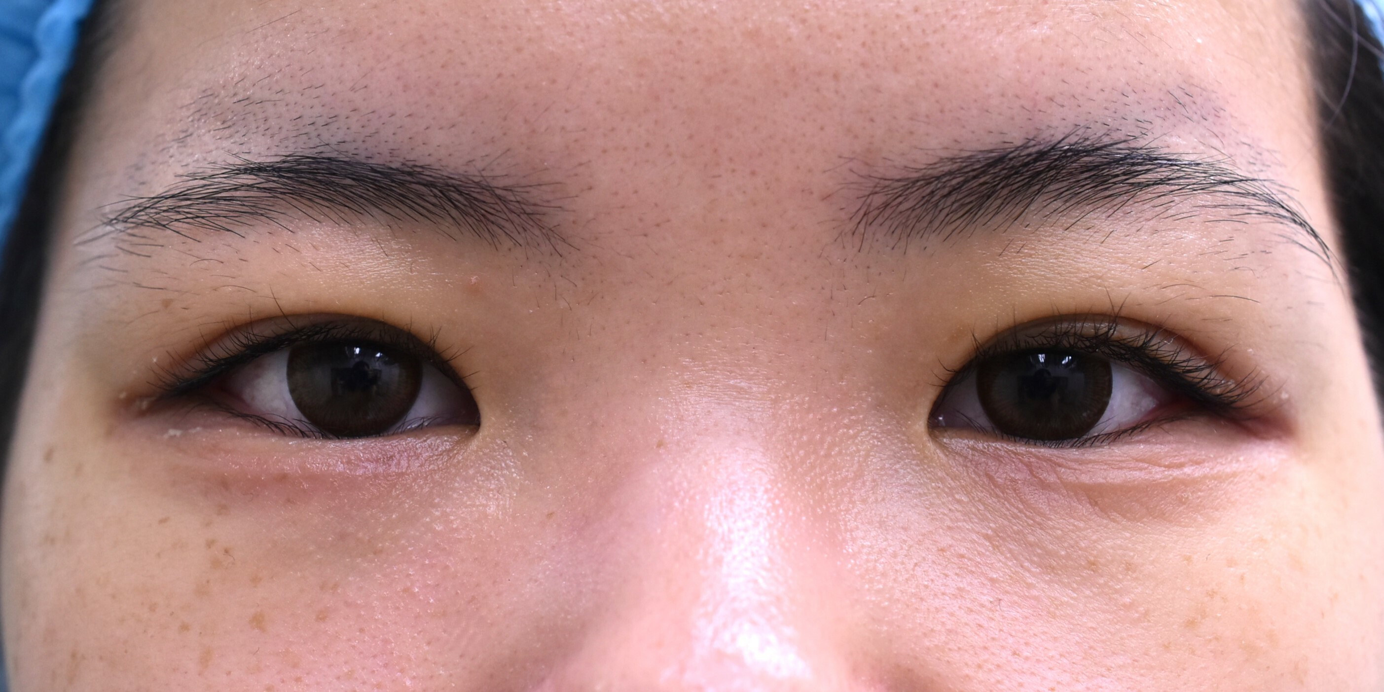 20代 女性の全切開法+目頭切開法症例になります。二重幅をひろげたい、目の開きを良くしたいとの希望にて、前記手術となりました。二重幅は8mmで行い、逆さまつ毛改善目的に、たるみを1mm幅にて切除、併せて眼瞼下垂修正目的に挙筋の前転も行っています。