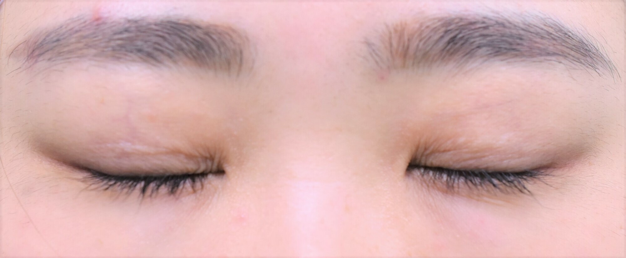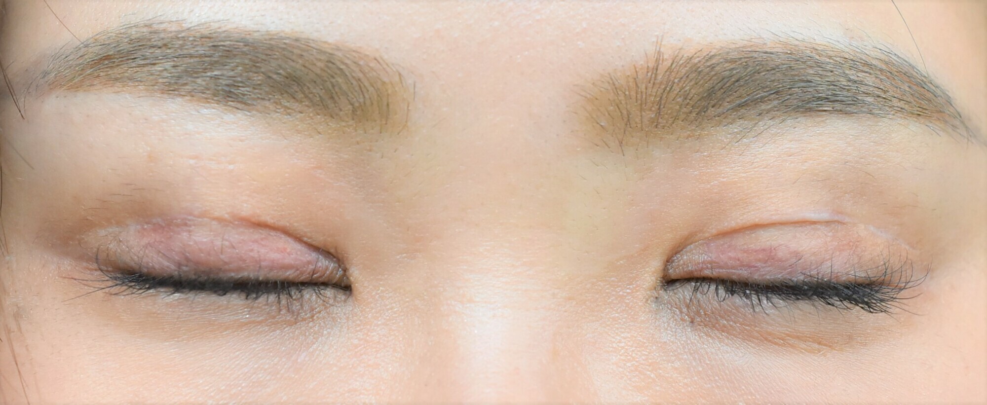 20代女性 全切開法症例になります。 二重幅を広げたい、目をぱっちりさせたいとの希望にて全切開法で二重幅を広げ、合わせて逆さまつ毛の改善を行っています。二重幅をひろげると腫れぼったさが目立つため、ROOF脂肪も併せて切除しています。