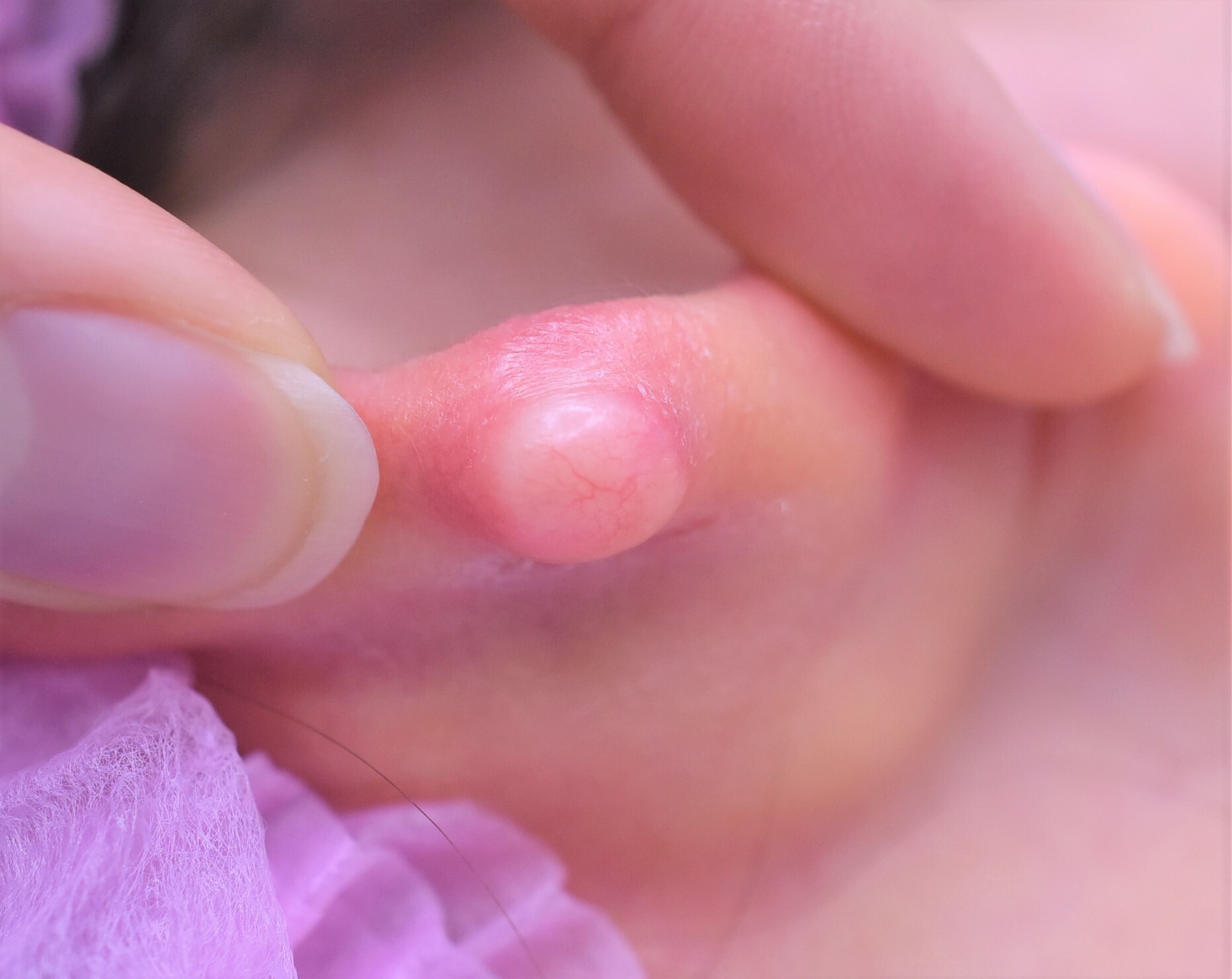20代女性 耳介肉芽腫切除症例になります。軟骨ピアス後に生じたケロイドで、手術取り除くのが基本となります。局所麻酔で手術を行い、30分程度で終了します。有茎性のものほどきれいになりますのでご相談ください。当日手術も可能です。