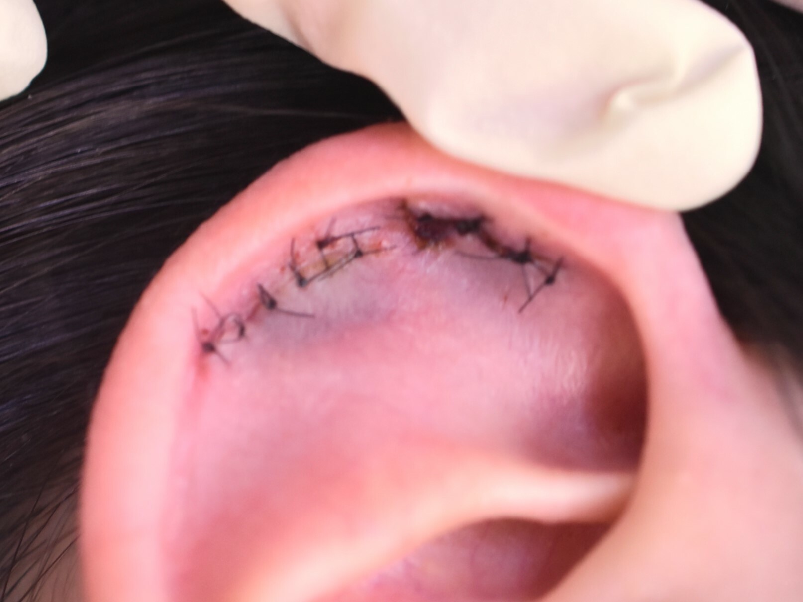 3年前にあけた右耳軟骨ピアスのあとにできたケロイドの切除を行いました。写真は1週間後の抜糸の時のものですが、ふくらみがなくなっています。内出血もなく、経過は順調です。