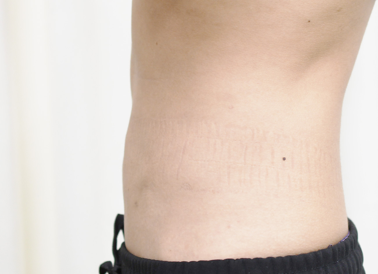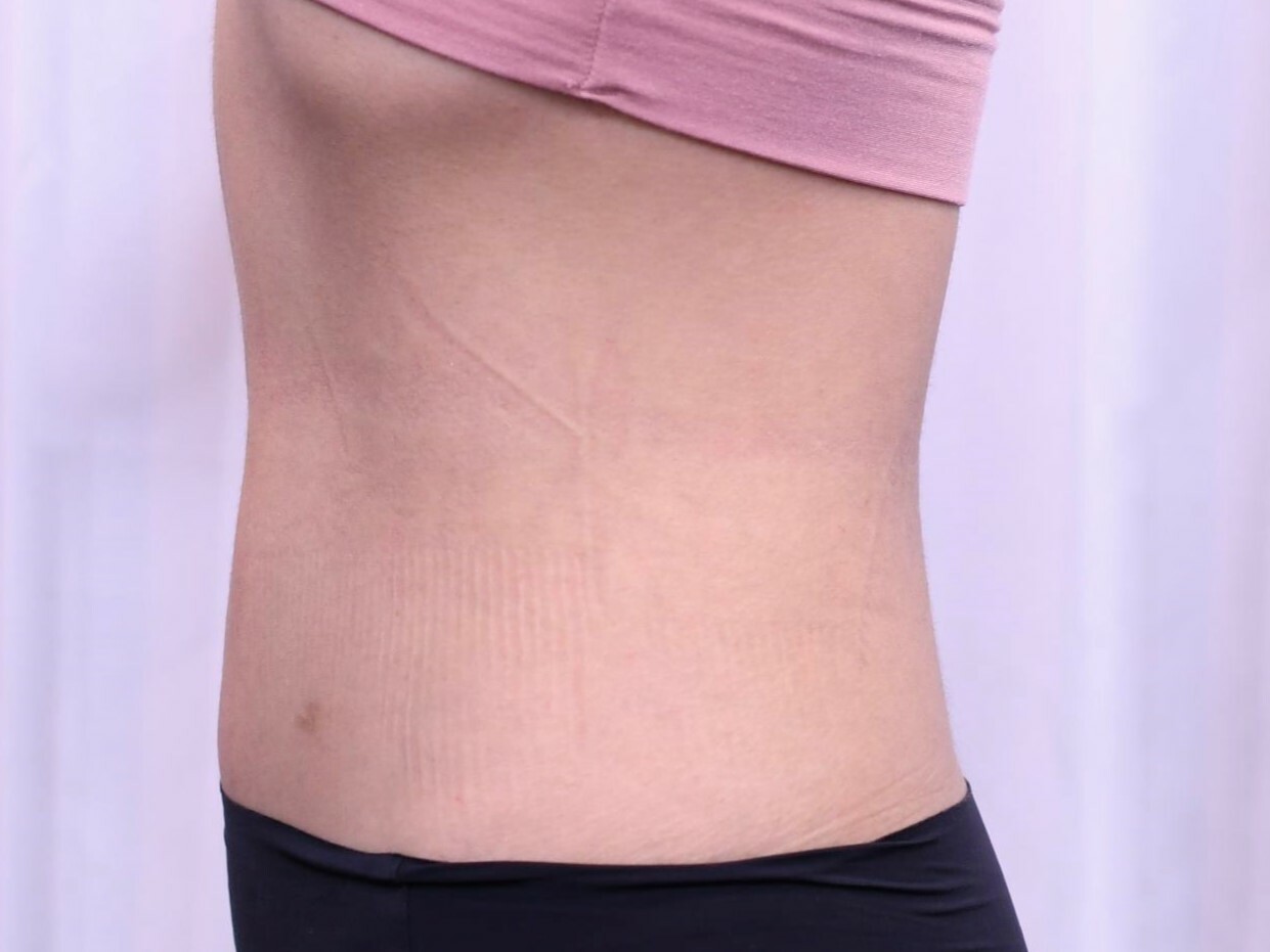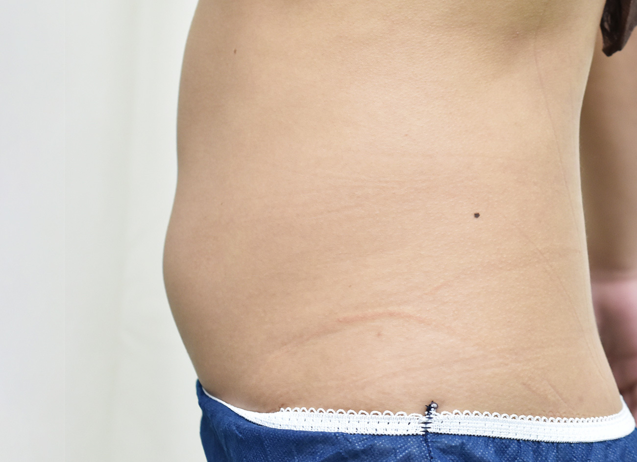 20代女性の上腹部を除くウエスト周りを細くする脂肪吸引症例です。脂肪注入豊胸術にあわせて脂肪吸引を行いました。脂肪吸引は500cc程度でしたが、6M後の症例写真では、下腹部のポッコリ感がなくなり、ウエストのくぶれがよりはっきりできています。傷もわからないくらいきれいになっています。