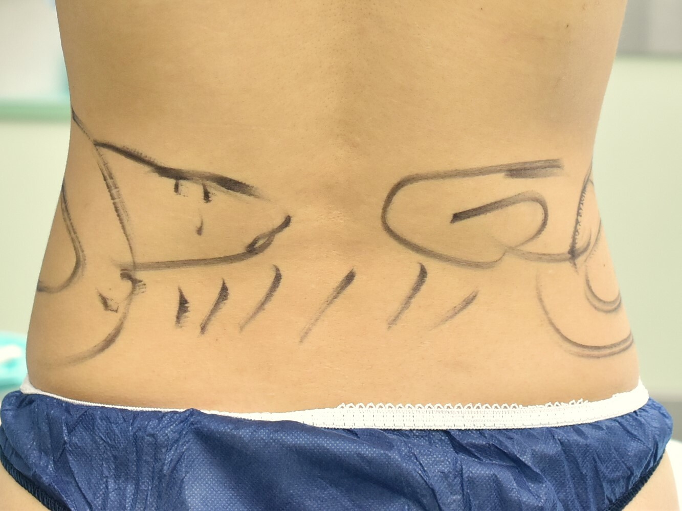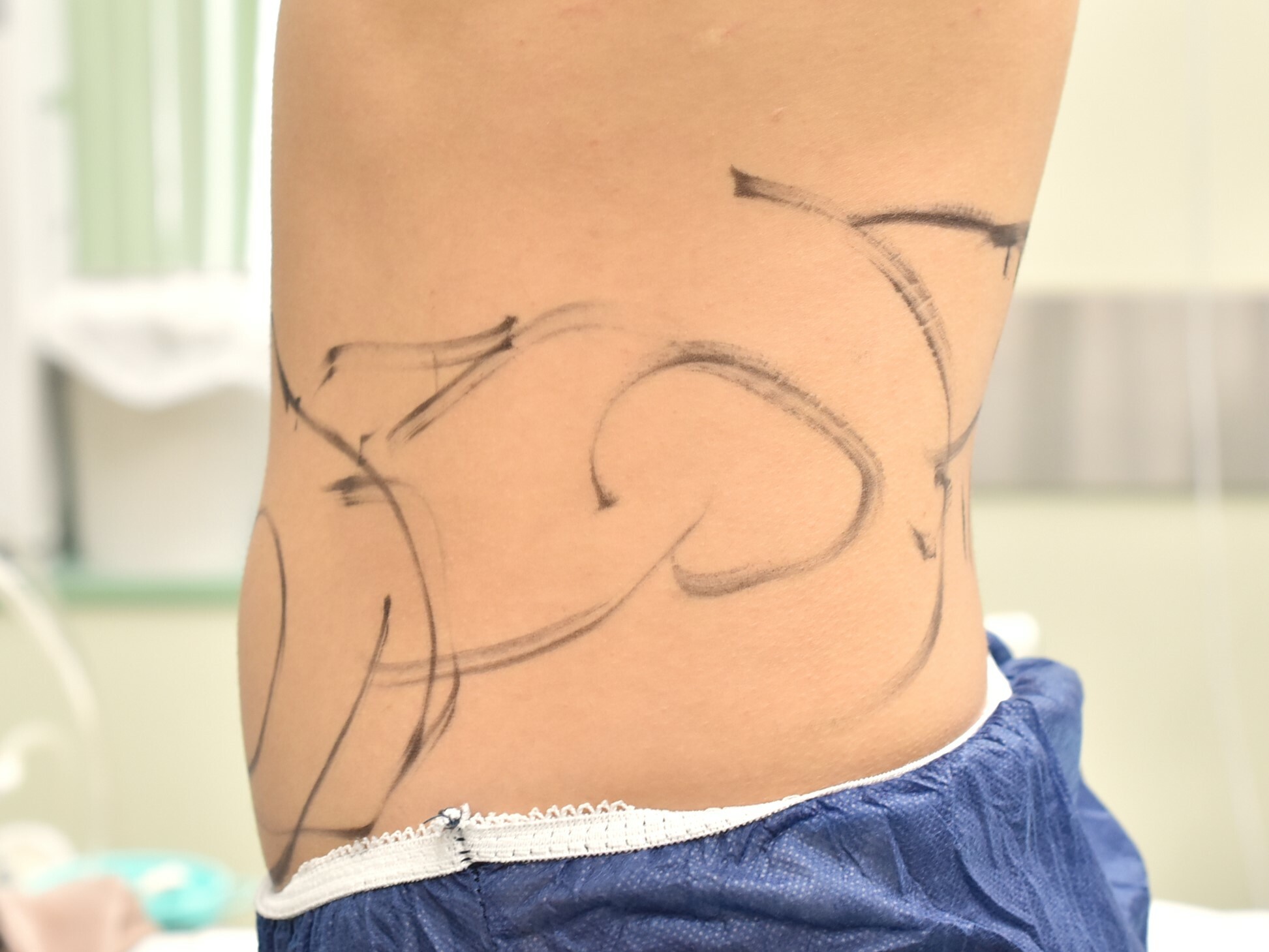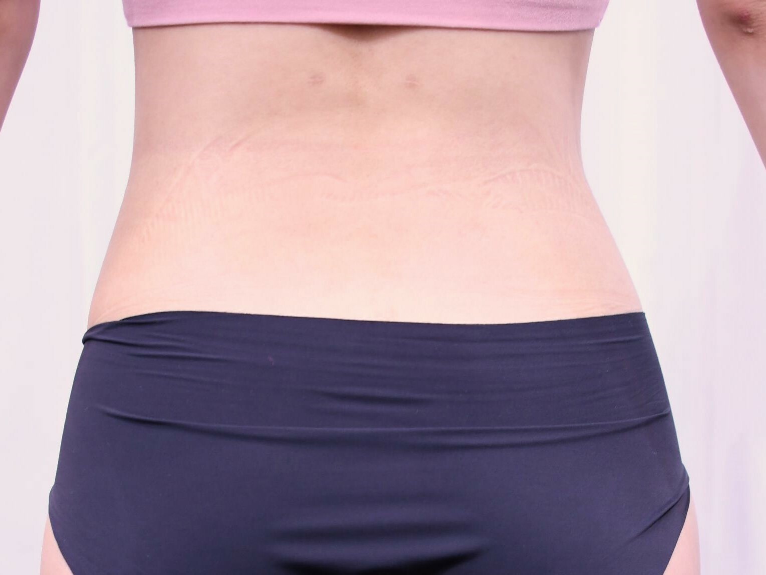 20代女性の上腹部を除くウエスト周りを細くする脂肪吸引症例です。脂肪注入豊胸術にあわせて脂肪吸引を行いました。脂肪吸引は500cc程度でしたが、6M後の症例写真では、下腹部のポッコリ感がなくなり、ウエストのくぶれがよりはっきりできています。傷もわからないくらいきれいになっています。