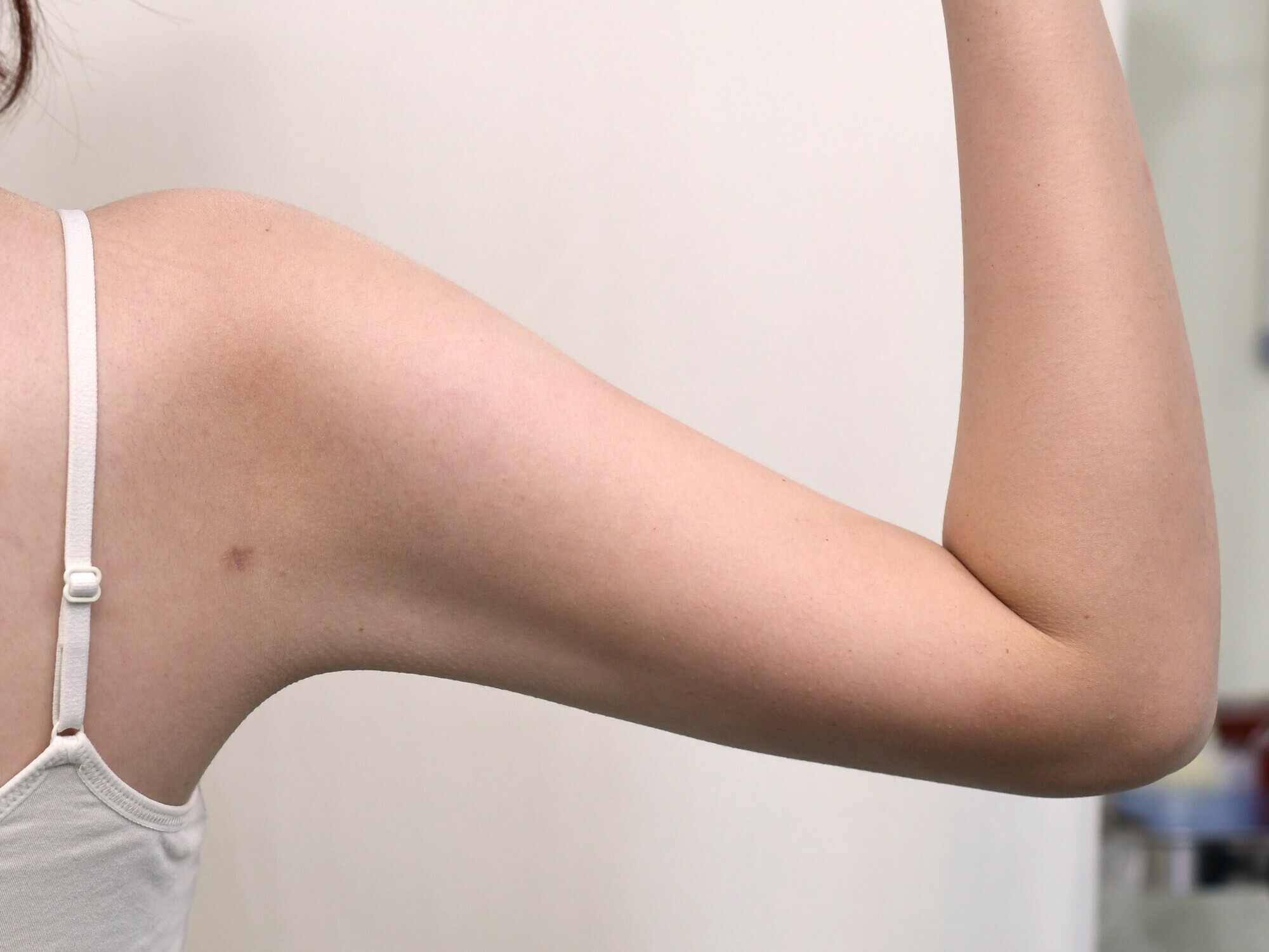 20代女性の上腕脂肪吸引の症例になります。できるだけ二の腕を細くしたいとの希望にて、脂肪吸引を行いました。一般的には仰向けで肘から吸引が普通なのですが、腕の付け根をできるだけ細くするために背面からも吸引行っています。