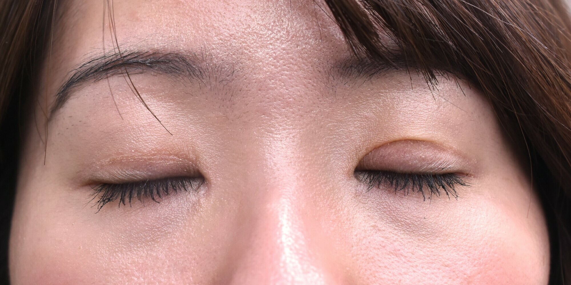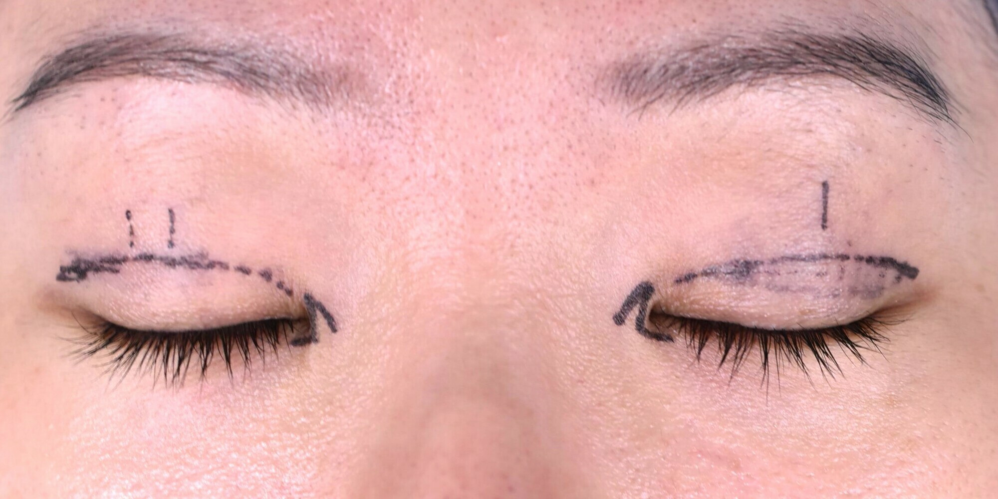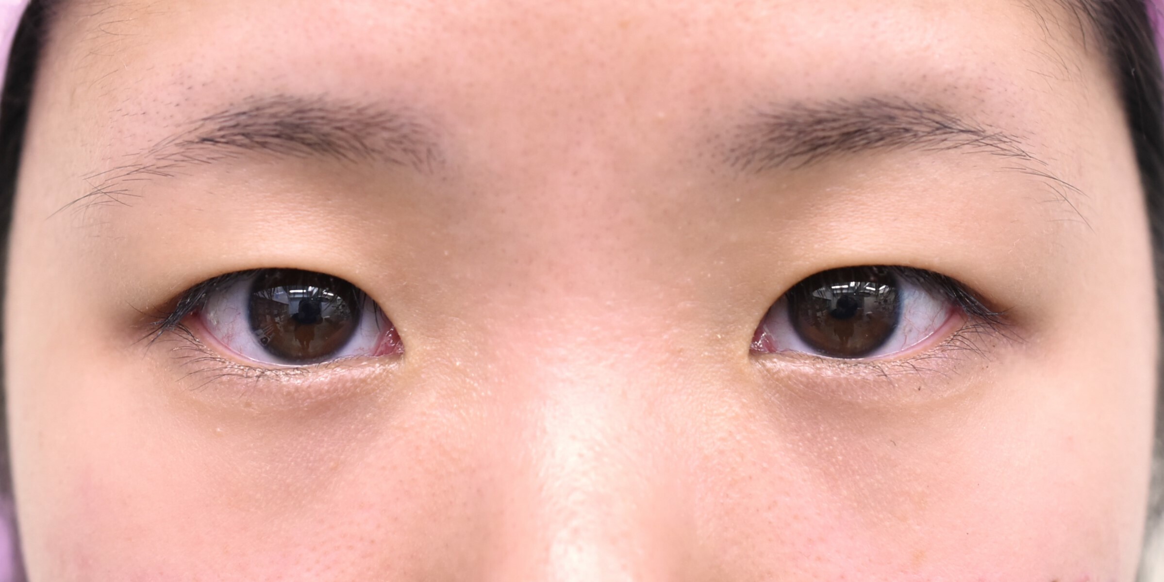 30代女性の全切開法(挙筋前転)+目頭切開 症例になります。二重をしっかり広げて平行型に近づけたいとの希望にて前記手術を行いました。二重幅は8.5mmで行い、併せてたるみ切除も行っています。挙筋のゆるみも認めたため、脱脂にあわせて挙筋前転も併せて行いました。目頭切開はZ法にて行っています。まつ毛の内反と、眉毛を上げる癖が消えたため、ぱっちりとしたお目元になりました。