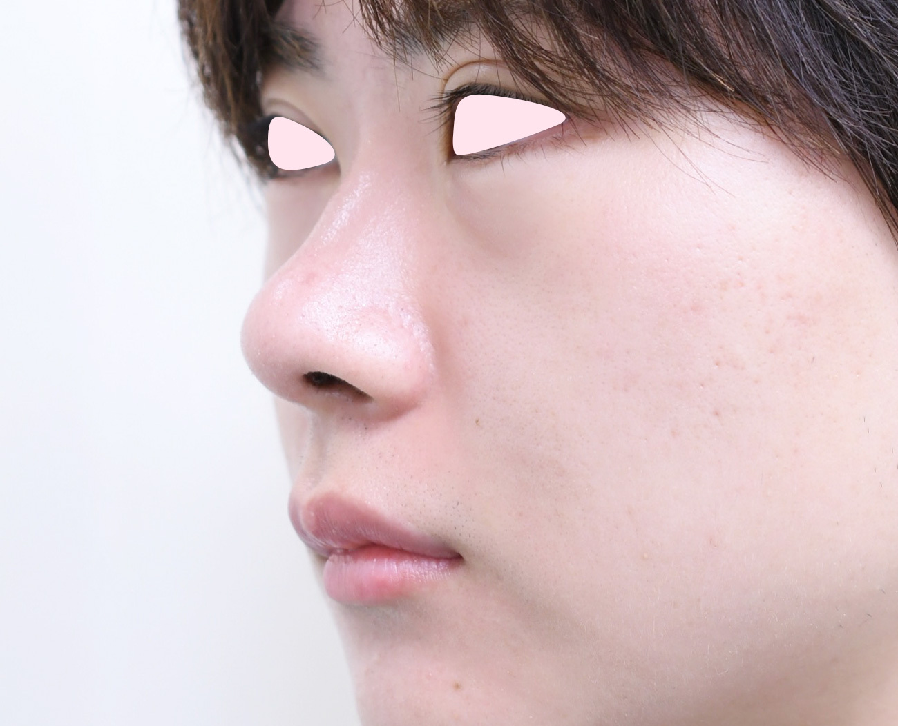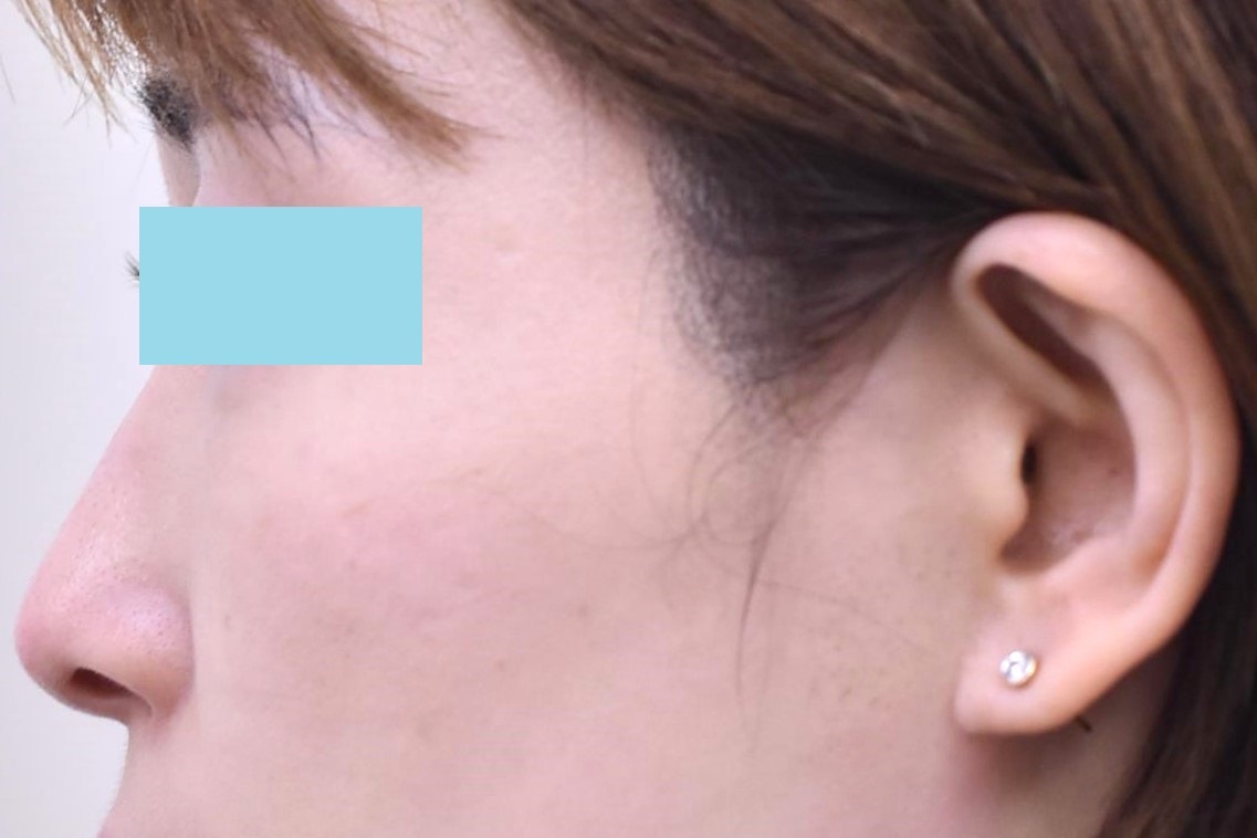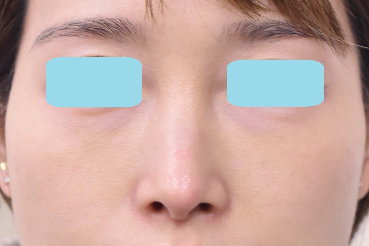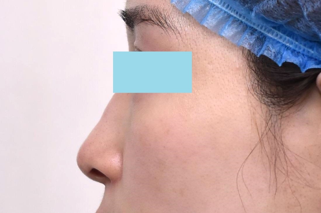 30代女性の、鼻プロテーゼ抜去症例になります。数年前に鼻プロテーゼを入れましたが、鼻の形の好みが変わったとのことで抜去行いました。術後、プロテーゼが入っていた部位の陥凹を気にされる方もおられますが、吸収されやすい脂肪はもともと少なく、鼻骨も吸収されることはほとんどありません。
