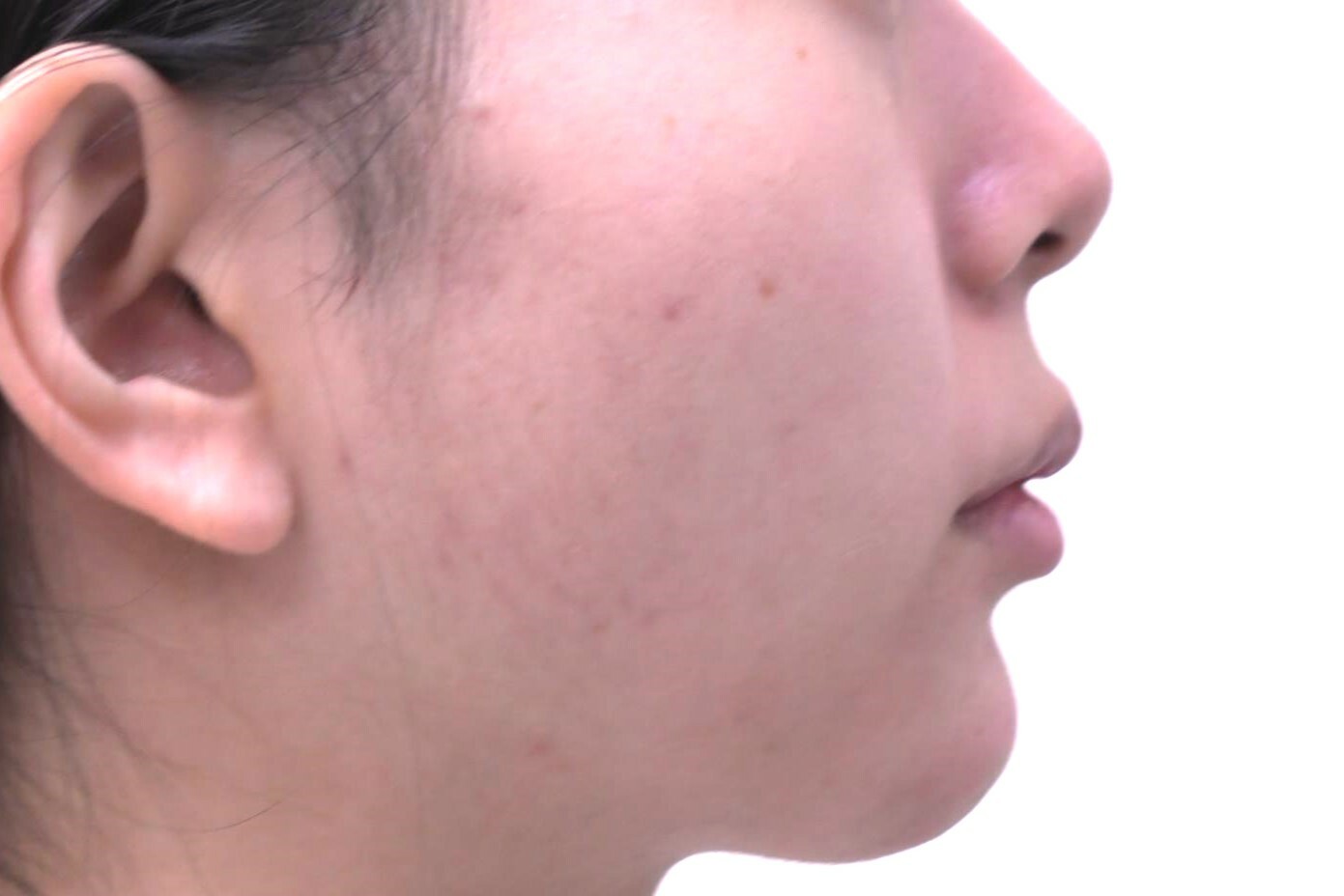 使用したヒアルロン酸は、輪郭形成用のヒアルロン酸、クレヴィエルを使用しています。0.6ccを注入しました。注入後1週間では、Eラインがそろうところまではいきませんが顎先がとがり気味になり、お顔を細く見せることに成功しています。残り0.4cch後日注入を予定しています。