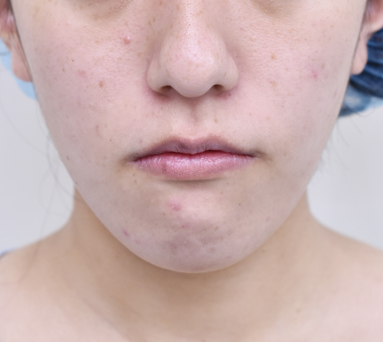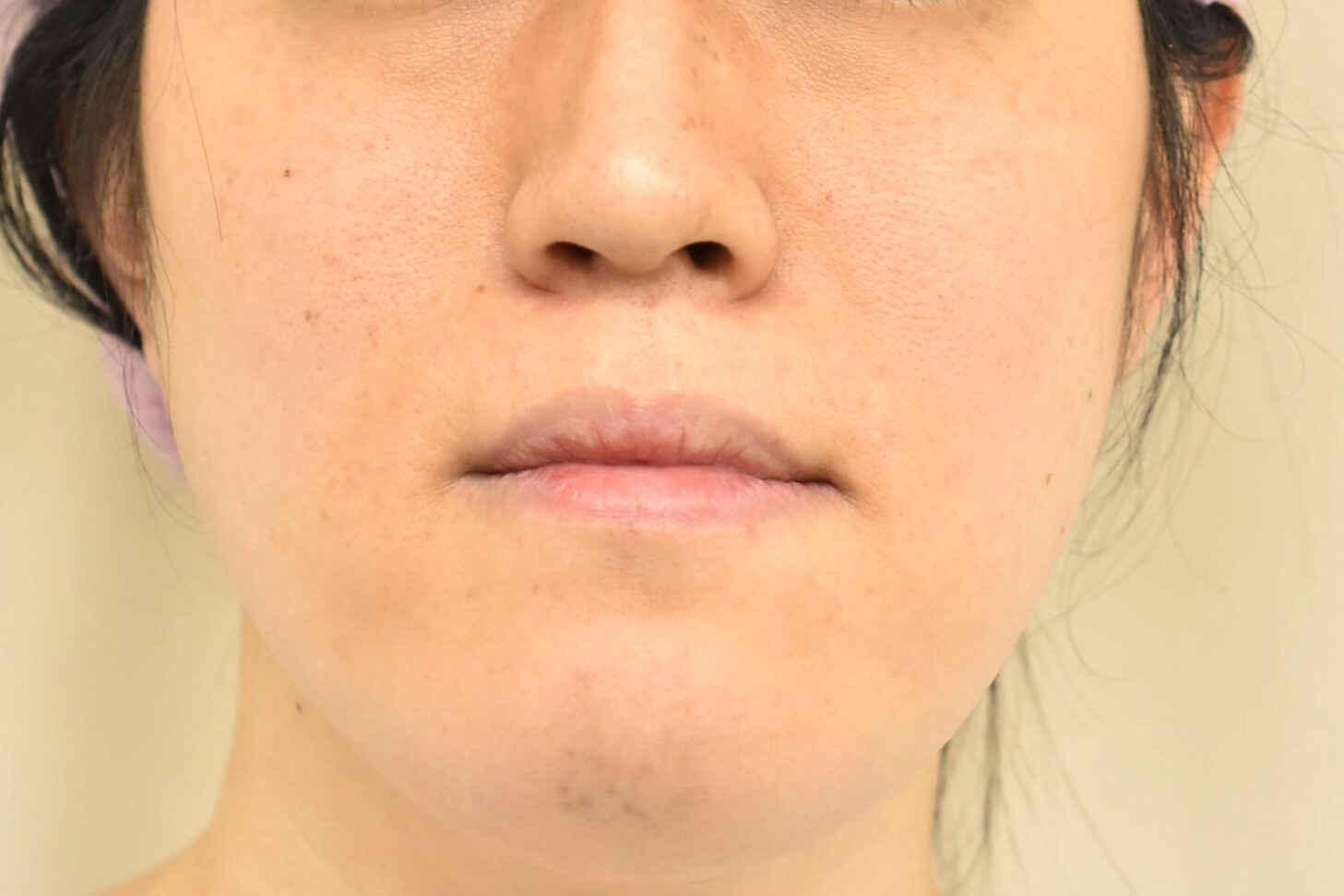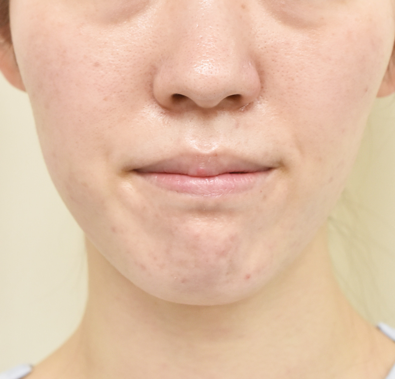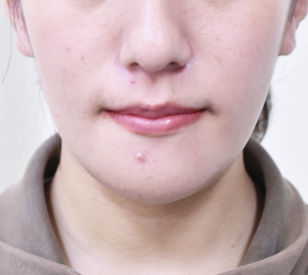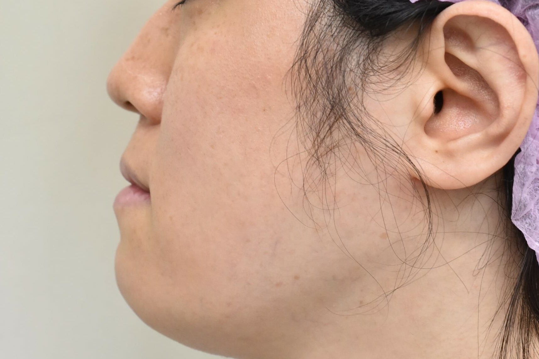 外観上、顎先が太く、横顔では下顎骨の出っ張りがわかり、十分小顔にはなっていません。