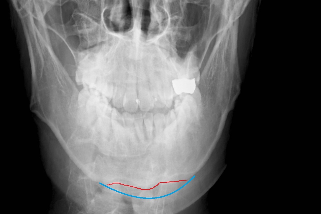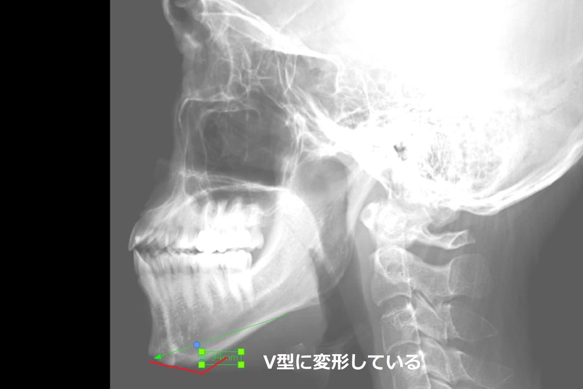レントゲン写真上も 顎先を水平に削っていますが、側面像では、V型の骨の出っ張りが残っています。