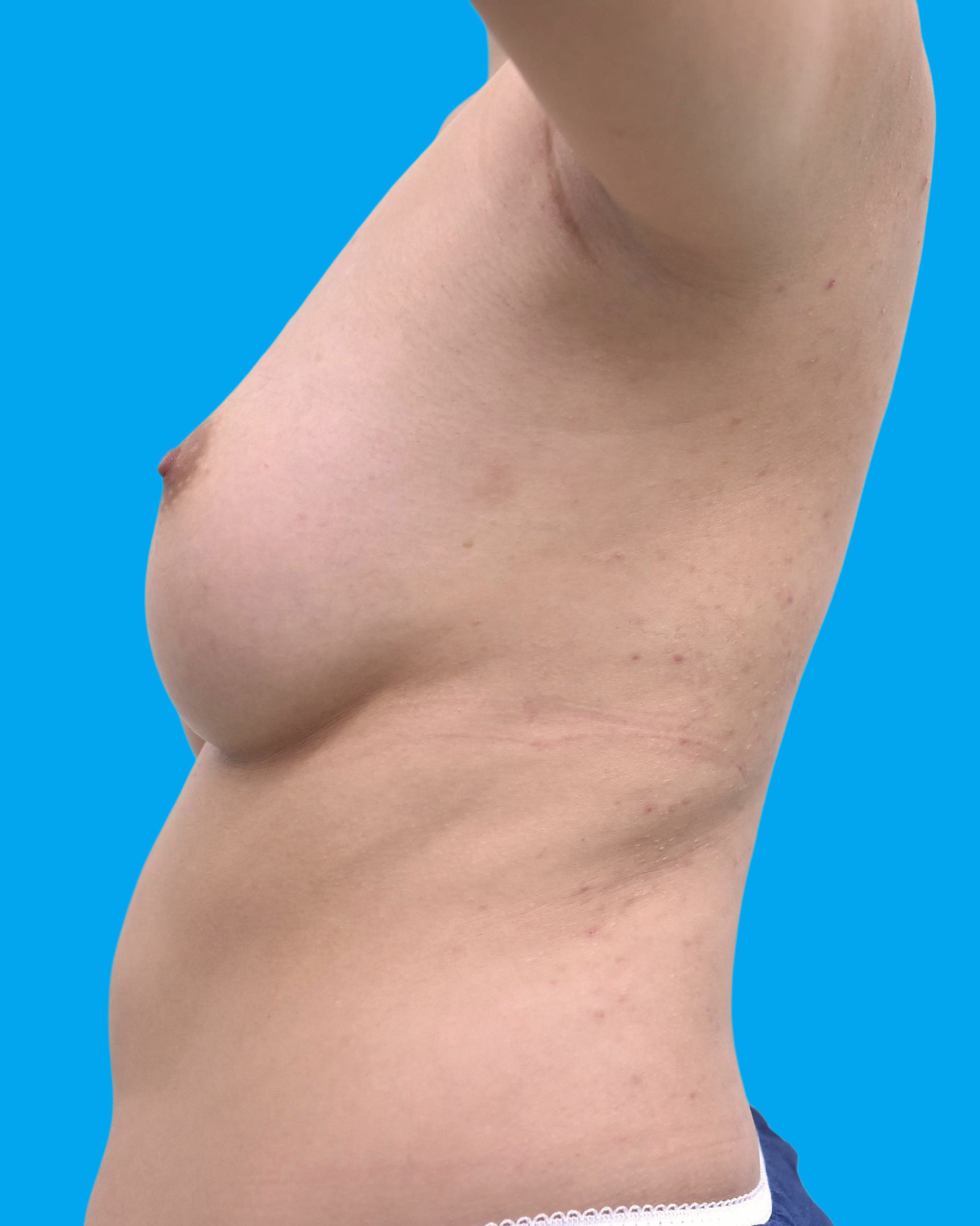30代女性の脂肪注入豊胸術症例になります。すでに175ccのコヒーシブシリコンバックが入っていますが、薄い形状のバッグを使用したらしく、胸の大きさに対してトップバストが低いことを気にされていました。トップバストを高くすることを目的に脂肪注入豊胸術を行っています。 大腿おもて面、内側2か所から脂肪吸引を行い、ピュアグラフトを使用して脂肪を精製しています。左右ともに150ccずつ脂肪注入を行いました。 3か月検診時、斜めと横から見た場合、トップバストが高くなっているのがわかります。約1カップアップしました。