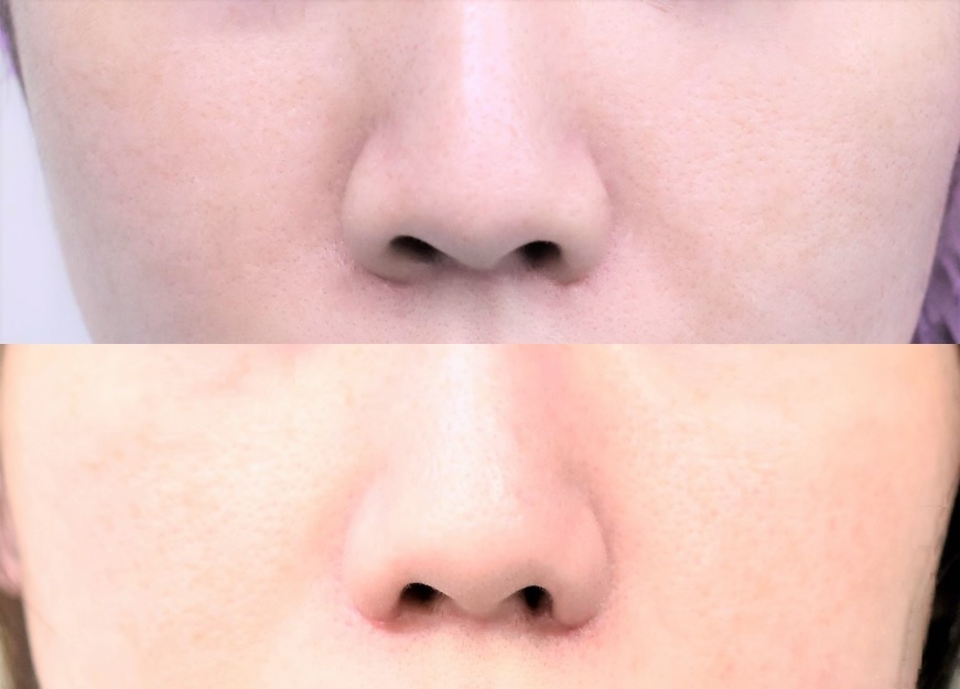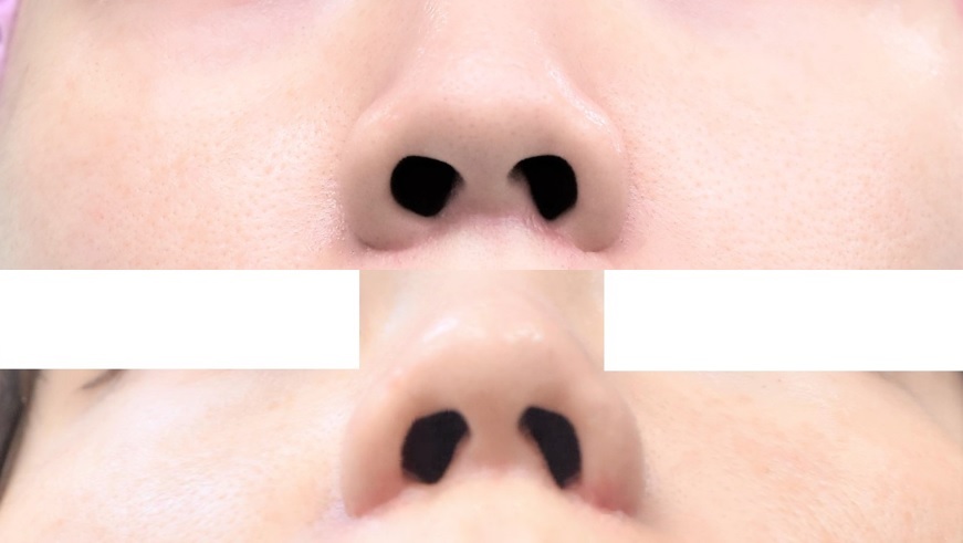 鼻翼基部が頭側に移行し、鼻の穴が見えにくくなり、小鼻自体も目立たなくなっています。