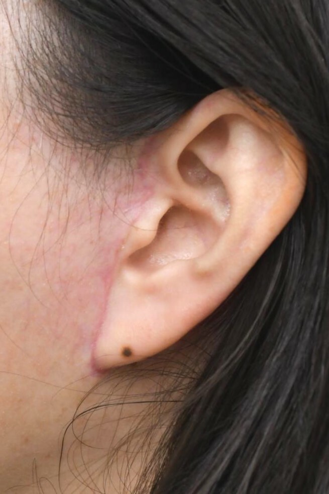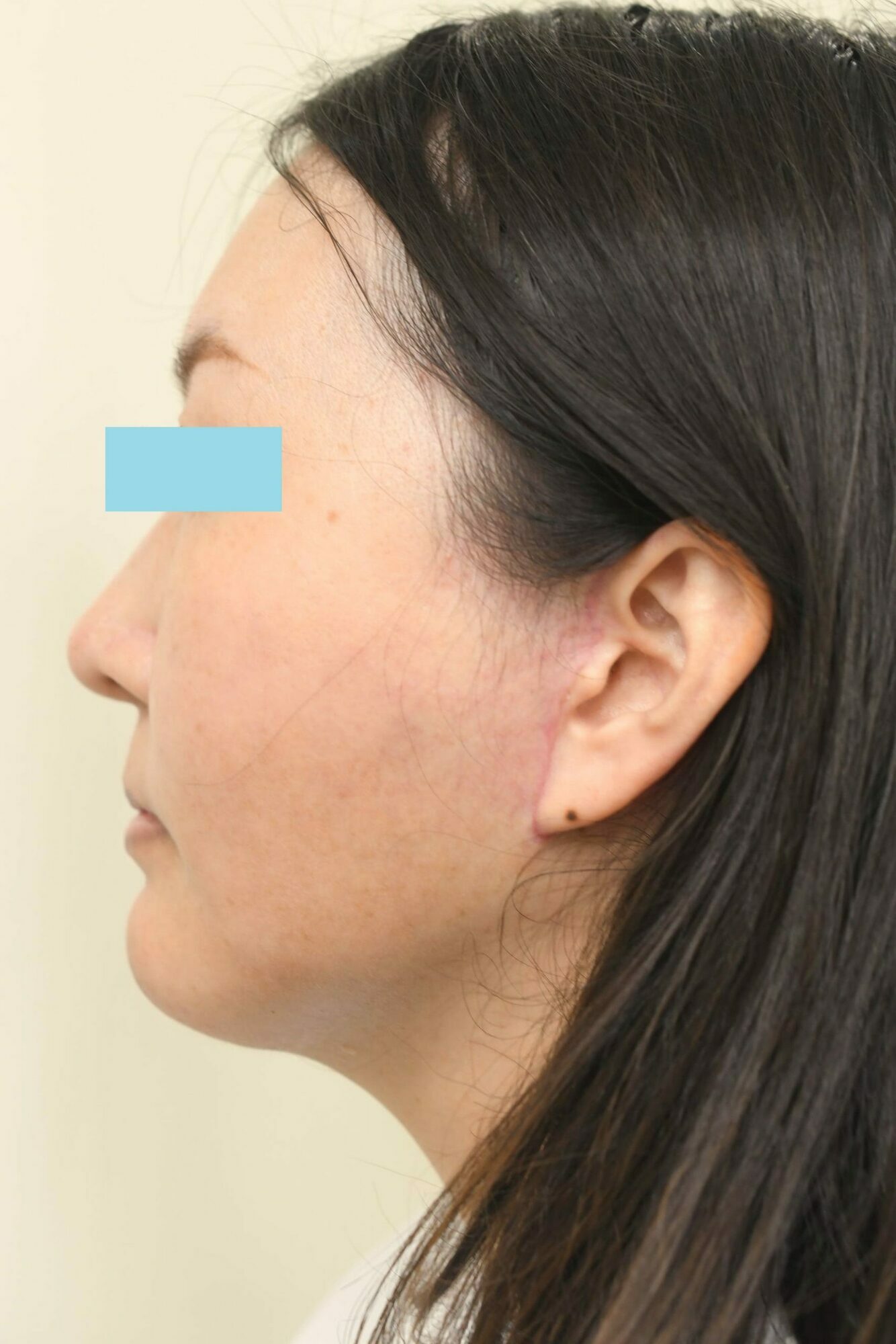 40代女性のフェイスリフト(頬+首)+頬、下顎脂肪吸引症例になります。糸でのリフトアップにも限界を感じられたため、患者様希望にて前記手術を御こなっいました。静脈麻酔下にまず脂肪吸引を行い、左右の頬から12cc ずつ、顎下からは10ccずつ脂肪を吸引しました。頬のタルミは耳の前で最大3p幅で切除しています。術後写真は手術3M後ですが下顎骨のラインがすっきりとでています。
