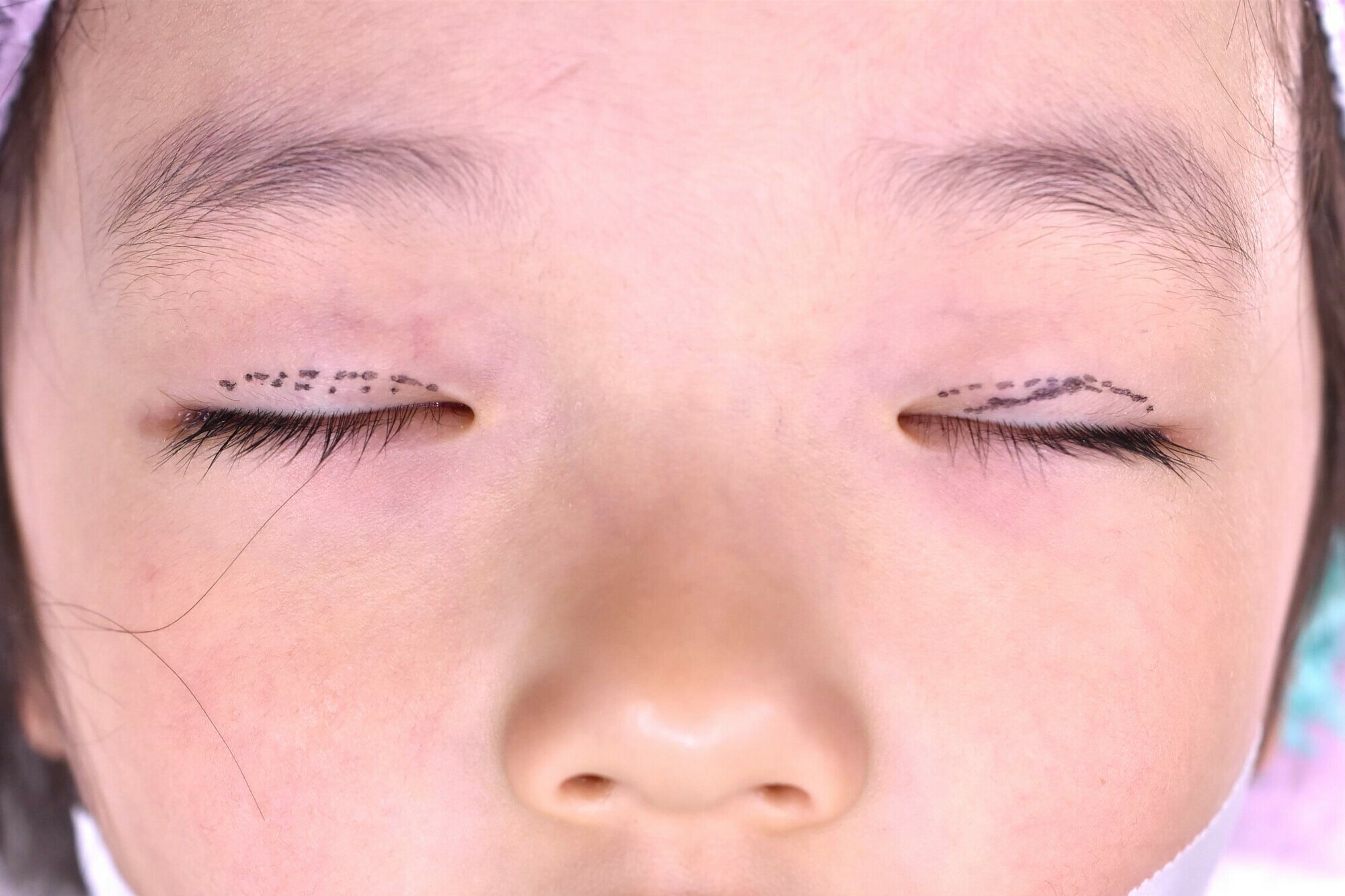 4歳の女の子の逆さまつ毛手術です。逆さまつ毛の改善とともに、二重にしたいとの本人の希望にて埋没法を行いました。