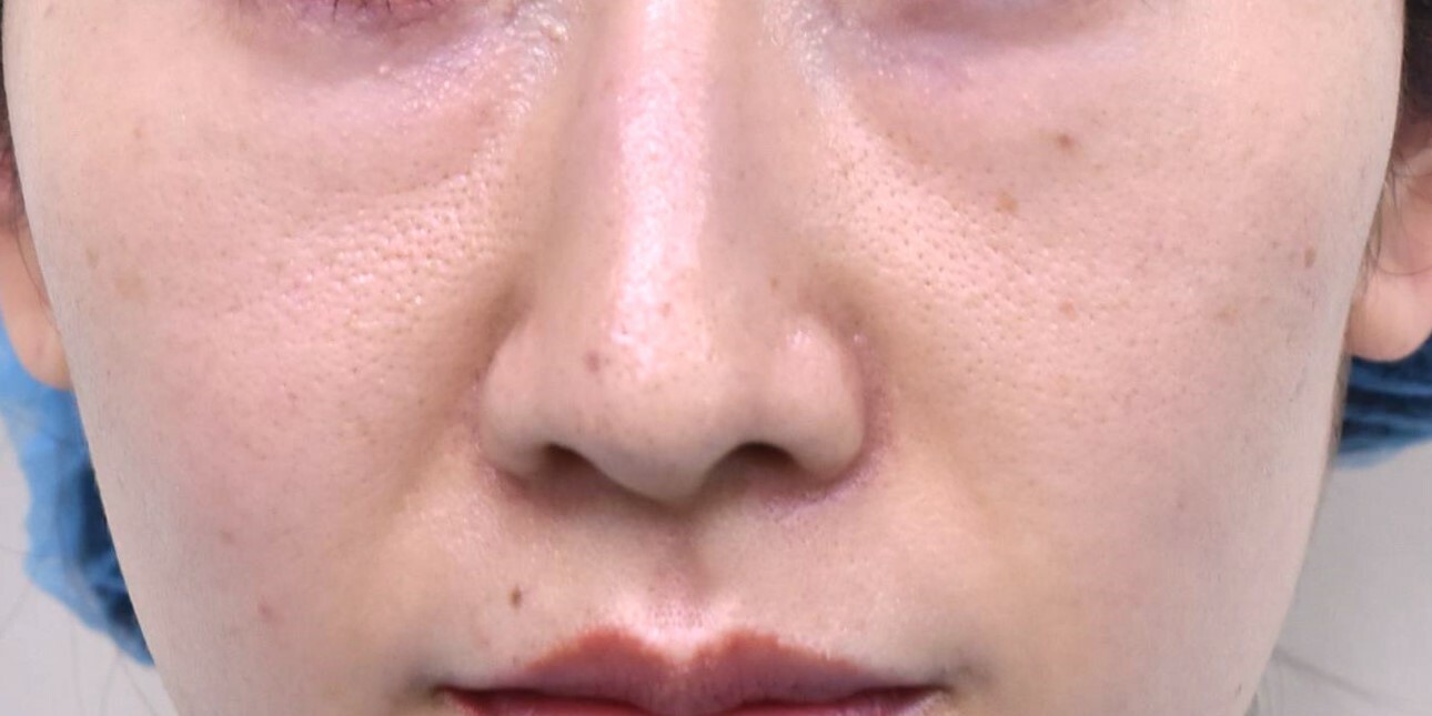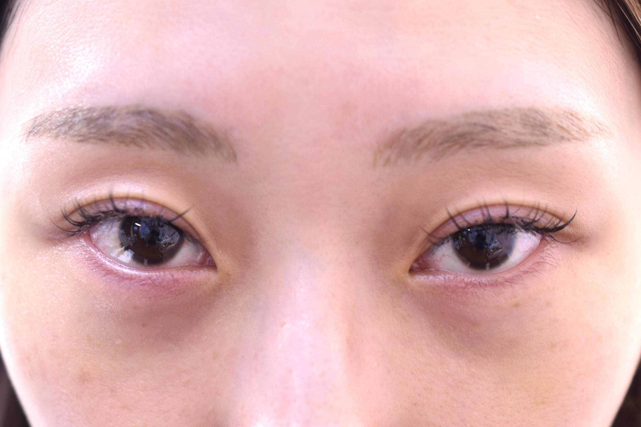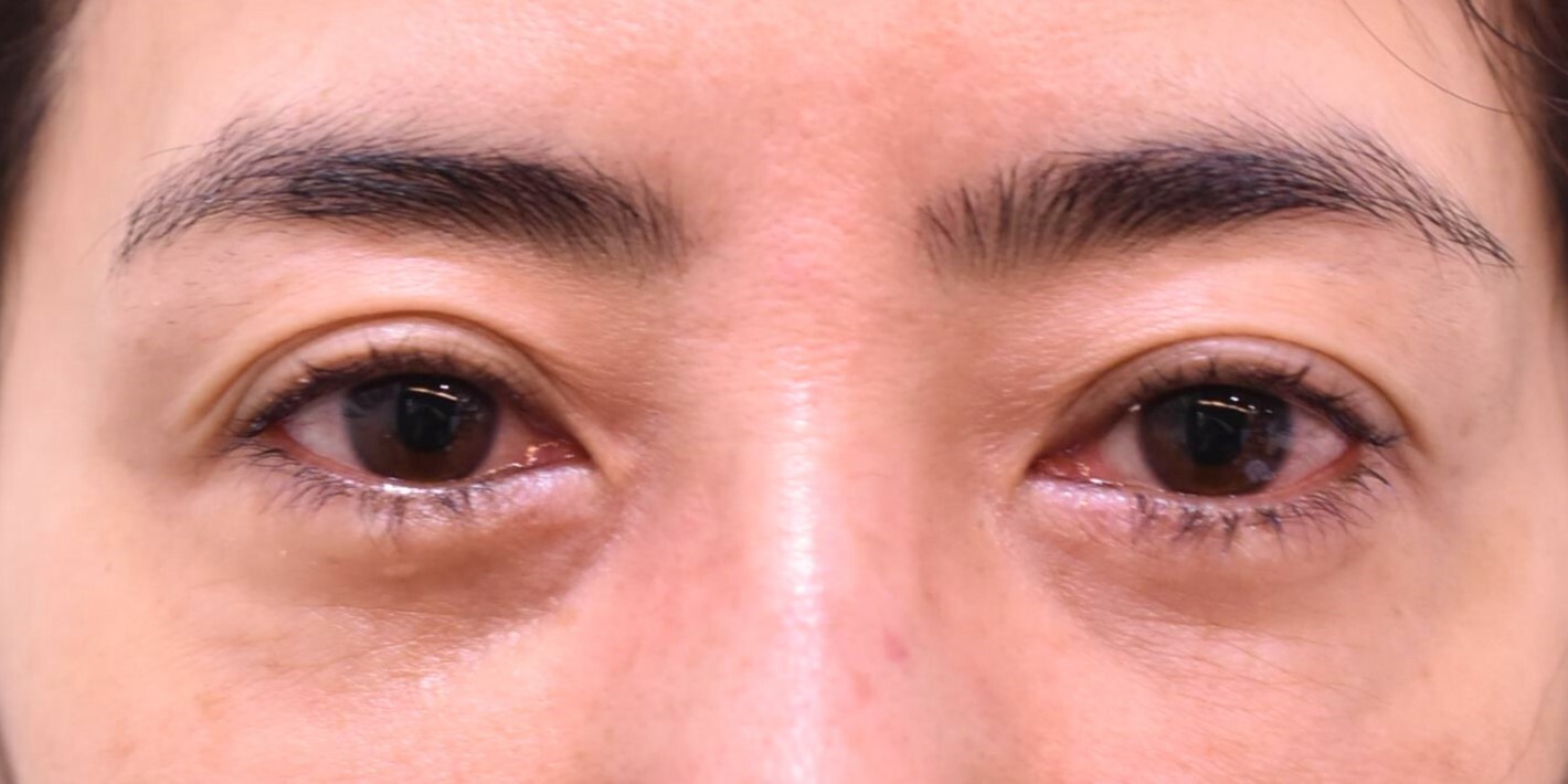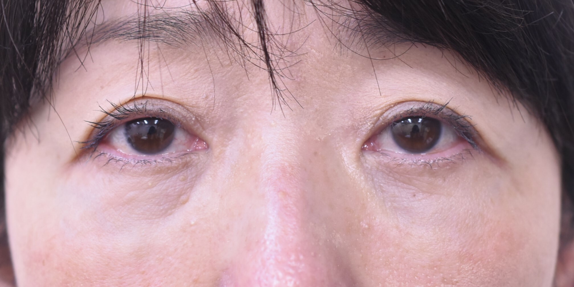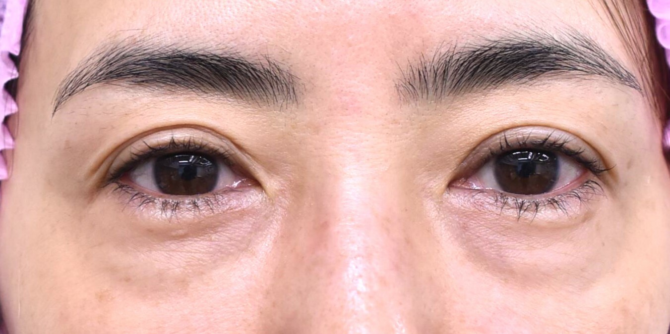 50代女性の結膜側下眼瞼脱脂症例になります。目元のクマ改善の目的で前記手術行っています。下眼瞼の皮膚のたるみが少なかったため、たるみ切除せずに脱脂だけで改善しています。内出血が出てしまいましたが、1ヶ月検診ではほとんどなくなり、自然なお目元になりました。