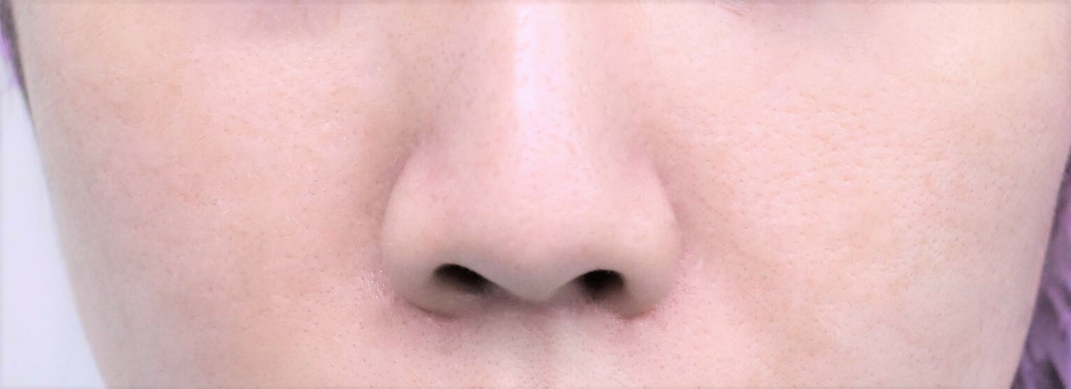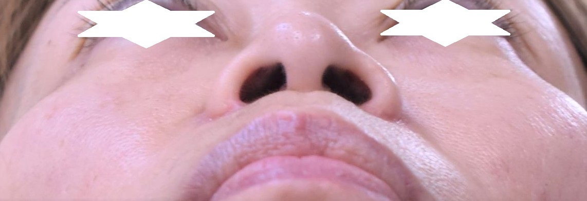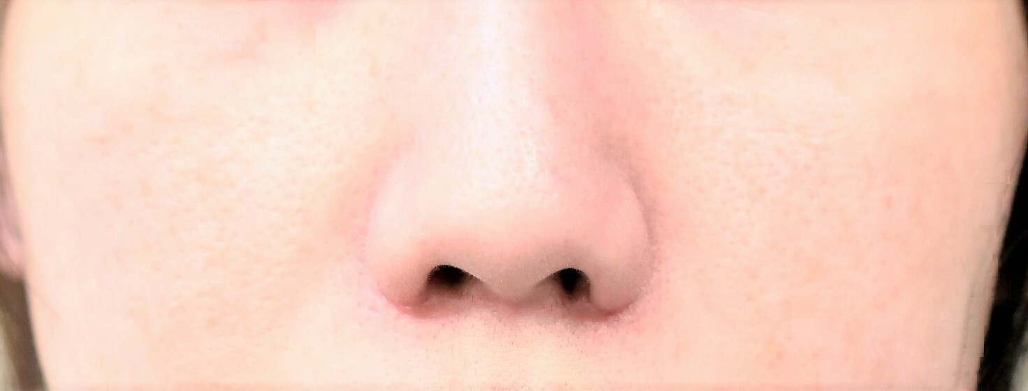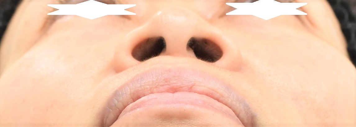 50代の女性の鼻翼縮小外側切除症例になります。鼻が大きい、横幅が広く鼻の穴が見えるなどが気になるとの主訴にて来院されました。控えめな変化でいいとの希望にて4mm幅にて切除し、術中のミラーチェックにて変化が確認できたためそれ以上の追加切除は行っていません。鼻翼の横幅を狭くするとともに、小鼻の丸みの改善、鼻先を下に向ける効果をだすことができました。