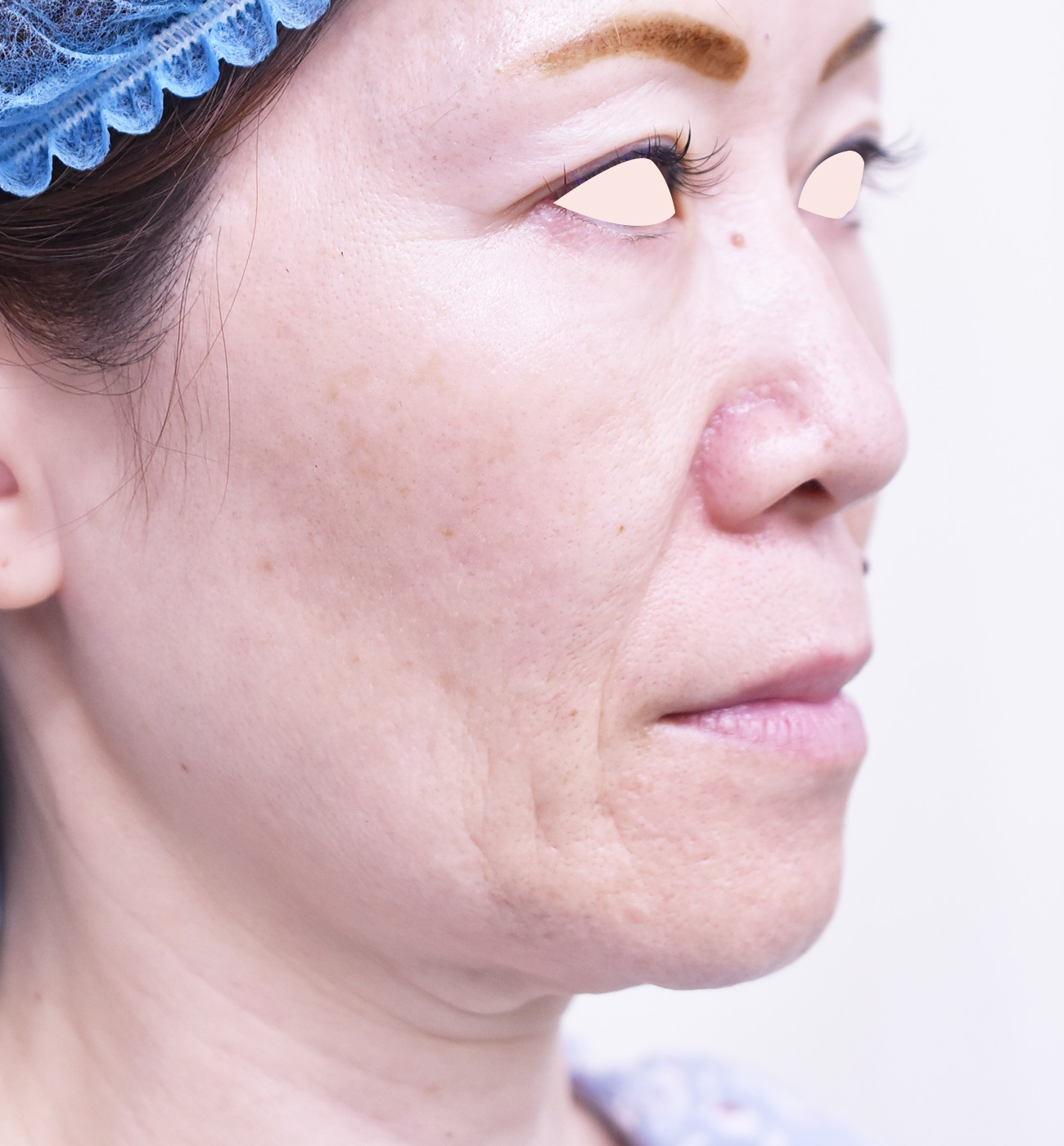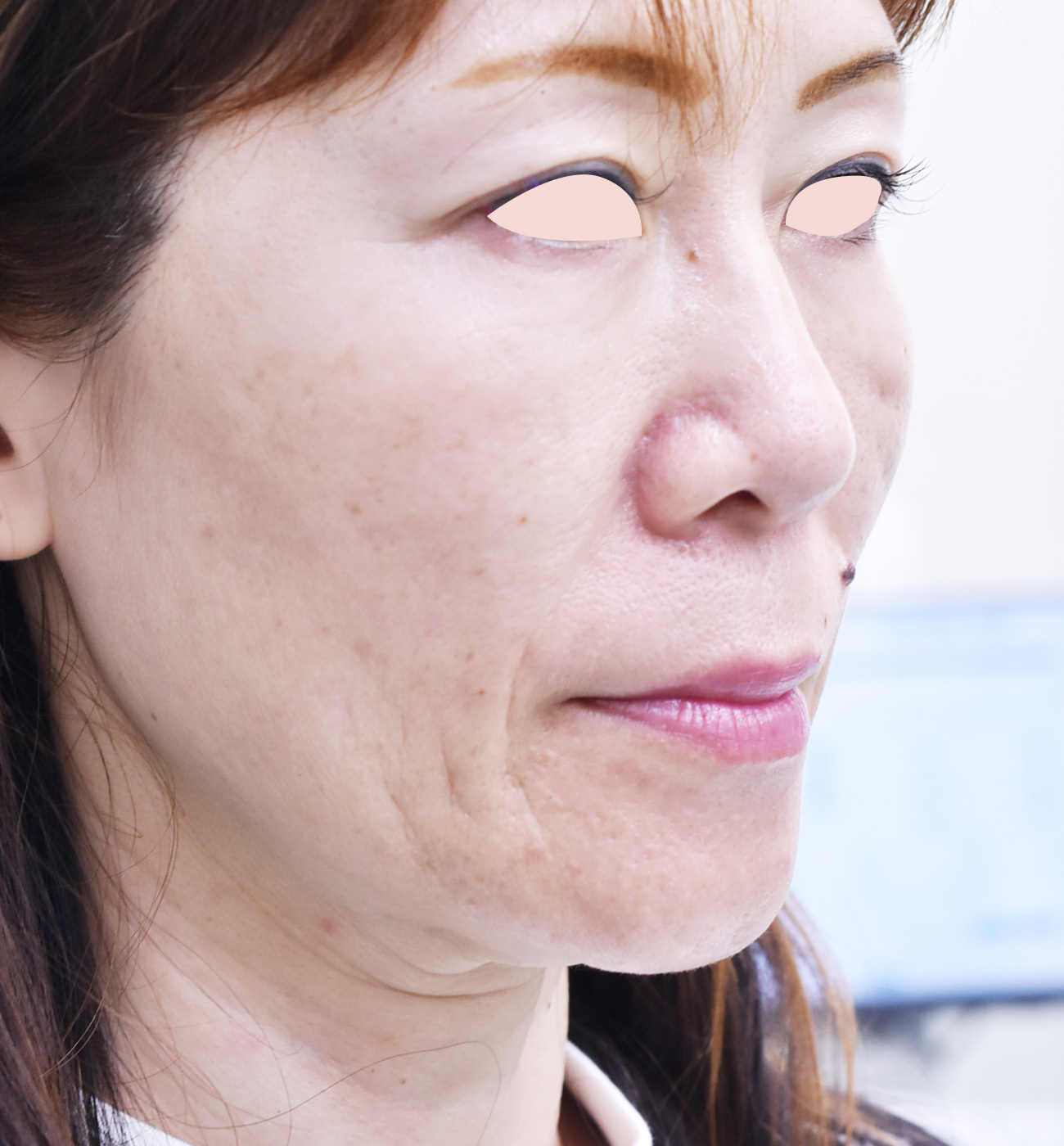50代女性のスレッドリフト症例になります。法令線、マリオネットラインの弛みの改善目的にバイニードルリフトを片方につき4本ずつ入れています。溶けるまでに2年以上持続するPCLを原料としているため、従来の糸と比較しても長期間のリフトアップ効果を期待できます。術後写真は、1週間後のものですが、腫れ、内出血もほとんどなく、リフトアップの効果を実感していただけました。
