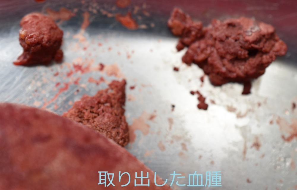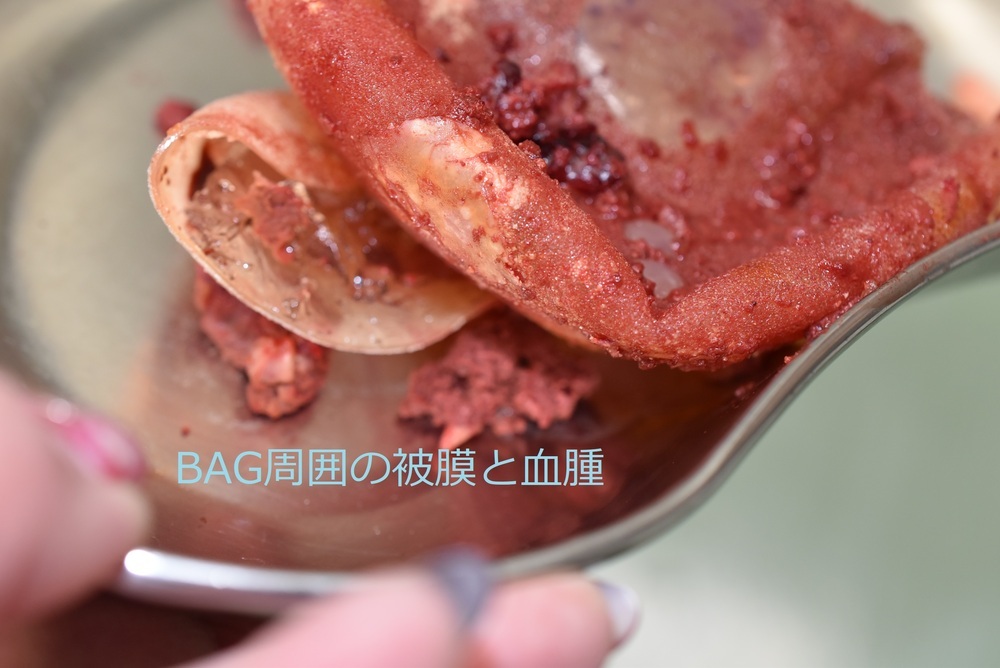 バッグ周囲には大量の血の塊と分厚い被膜を認めたため、可能な限り除去いたしました。以前よりも15%程度小さめのサイズのモティバを入れて終了としています。