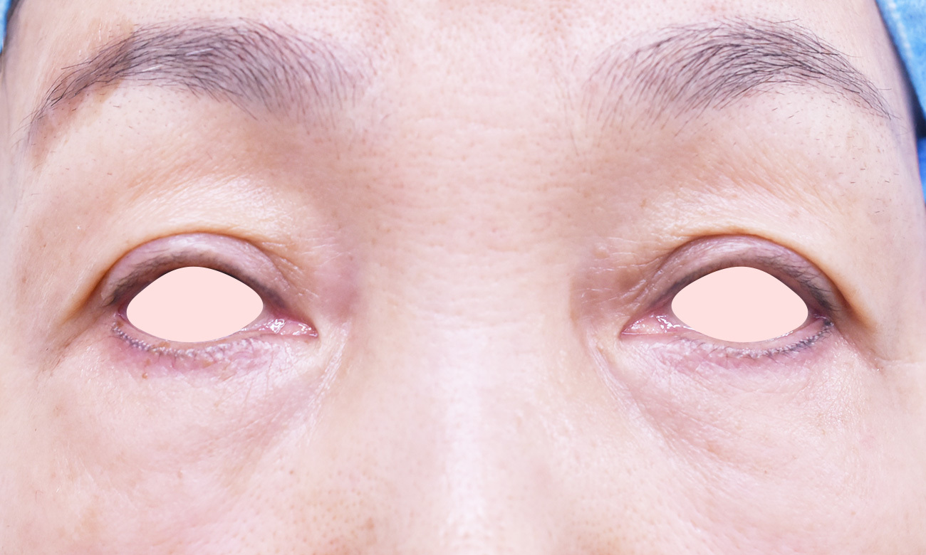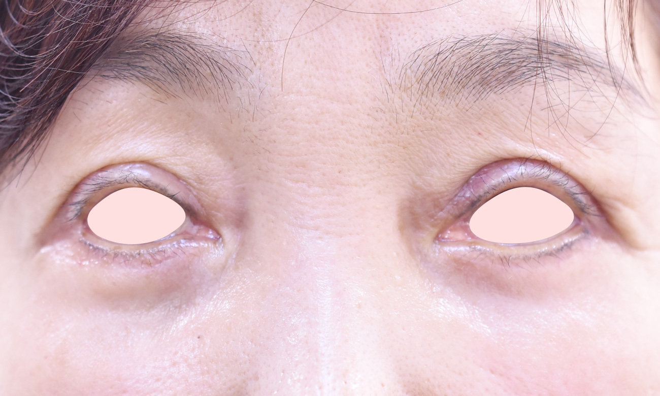60代女性の、左中切開法+挙筋腱膜前転術の症例になります。左のみ眼瞼下垂があり、眉毛挙上の結果、上眼瞼に陥凹を生じています。また二重の癖が緩んできたため、前記手術をおこないました。