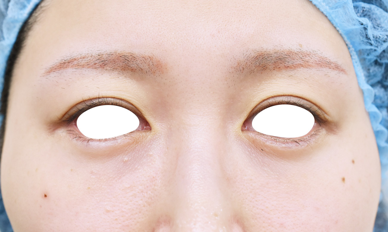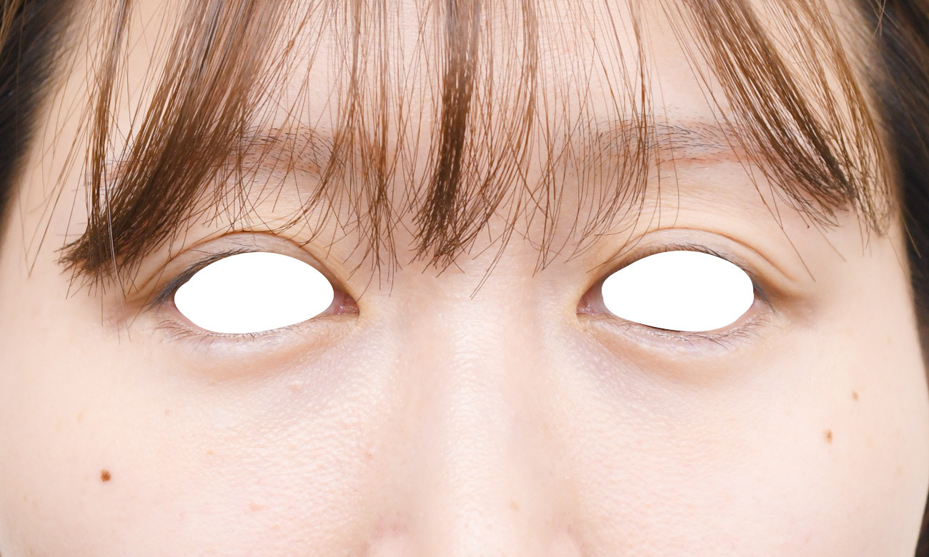 二重幅は8.5㎜ 切開の横幅は17㎜としました。くぼみ目は瞼の組織の厚みが薄く、二重ライン周囲の腫れがあるとうまく皮膚がかぶさらず、デザインよりも幅が広くなってしまいます。 1M検診まで、過重瞼があり、開瞼障害がみられましたが、3M検診時は改善し、右とほぼそろった二重になりました。写真のように眉毛挙上のために上眼瞼陥凹がある場合、眼瞼下垂修正で眉毛がさがり、陥凹も改善しています。