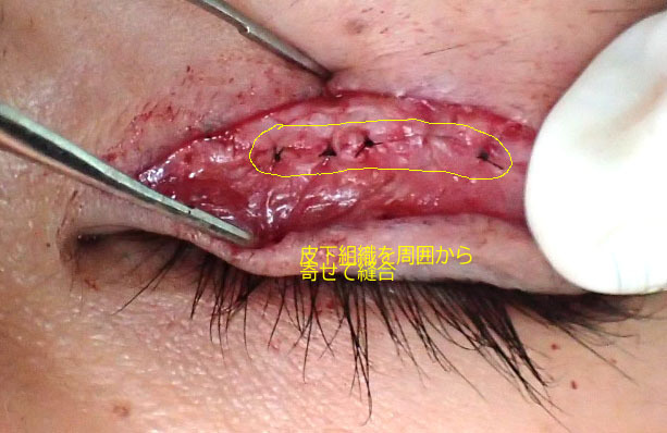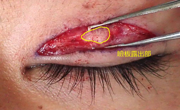 丁寧に剥離し、瞼板露出部に組織を寄せて