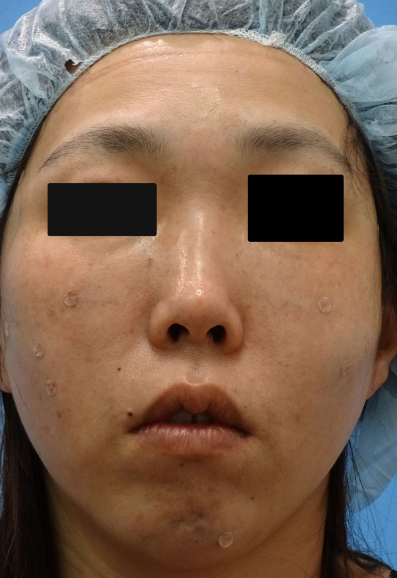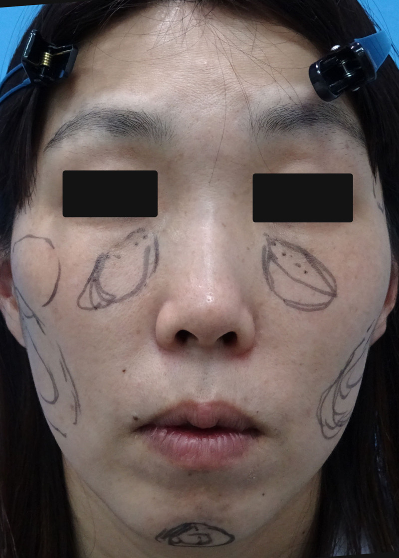 ゴルゴ線、頬、オトガイ先端に注入しています。