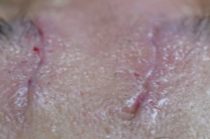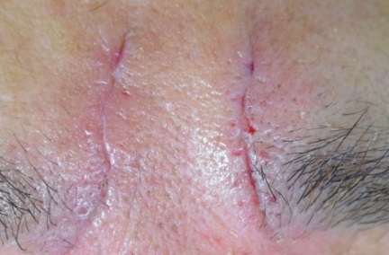 眉間のシワ直下の筋肉を縫縮したため、
