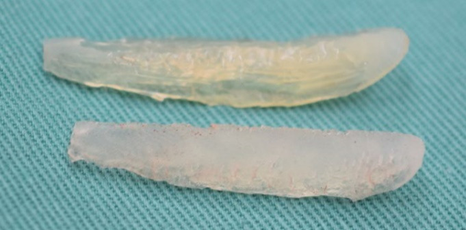 術後の腫れによって手術前よりも太く右に曲がったのを、