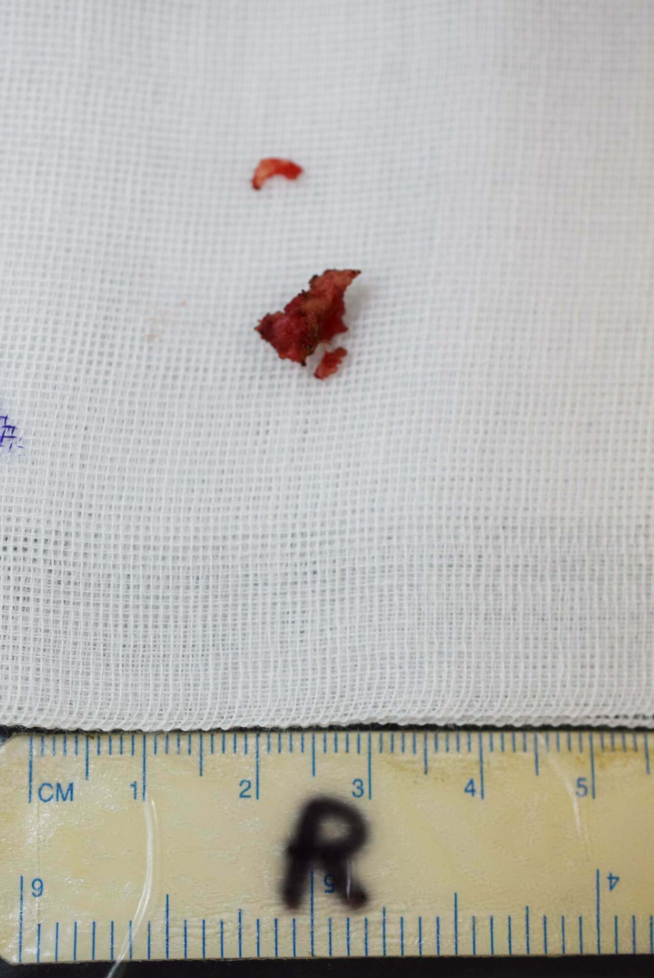 写真は、手術の際、左右の鼻翼軟骨の間から切除した軟部組織です。